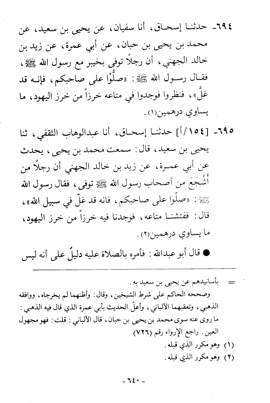 694 - حَدَّثَنَا إِسْحَاقُ، أنا سُفْيَانُ، عَنْ يَحْيَى بْنِ سَعِيدٍ، عَنْ مُحَمَّدِ بْنِ يَحْيَى بْنِ حِبَّانَ، عَنْ أَبِي عَمْرَةَ، عَنْ زَيْدِ بْنِ خَالِدٍ الْجُهَنِيِّ، أَنَّ رَجُلًا، تُوُفِّيَّ بِخَيْبَرَ مَعَ رَسُولِ اللَّهِ صَلَّى اللهُ عَلَيْهِ وَسَلَّمَ فَقَالَ رَسُولُ اللَّهِ صَلَّى اللهُ عَلَيْهِ وَسَلَّمَ: «§صَلُّوا عَلَى صَاحِبِكُمْ» فَإِنَّهُ قَدْ غَلَّ فَنَظَرُوا فَوَجَدُوا فِي مَتَاعِهِ خَرَزًا مِنْ خَرَزِ الْيَهُودِ مَا يُسَاوِي دِرْهَمَيْنِ "