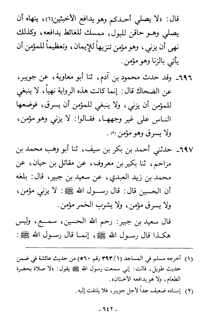 697 - حَدَّثَنِي أَحْمَدُ بْنُ بَكْرِ بْنِ سَيْفٍ، ثنا أَبُو وَهْبٍ مُحَمَّدُ بْنُ مُزَاحِمٍ، ثنا بُكَيْرُ بْنُ مَعْرُوفٍ، عَنْ مُقَاتِلِ بْنِ حَيَّانَ، عَنْ مُحَمَّدِ بْنِ زَيْدٍ الْعَبْدِيِّ، عَنْ سَعِيدِ بْنِ جُبَيْرٍ، قَالَ: بَلَغَهُ أَنَّ الْحُسَيْنَ، قَالَ: قَالَ رَسُولُ اللَّهِ صَلَّى اللهُ عَلَيْهِ وَسَلَّمَ: «§لَا يَزْنِي مُؤْمِنٌ، وَلَا يَسْرِقُ مُؤْمِنٌ، وَلَا يَشْرَبُ الْخَمْرَ مُؤْمِنٌ» قَالَ سَعِيدُ بْنُ جُبَيْرٍ: رَحِمَ اللَّهُ الْحُسَيْنَ سَمِعَ، وَلَيْسَ هَكَذَا قَالَ رَسُولُ اللَّهِ صَلَّى اللهُ عَلَيْهِ وَسَلَّمَ، إِنَّمَا قَالَ رَسُولُ اللَّهِ صَلَّى اللهُ عَلَيْهِ وَسَلَّمَ -[643]-: «لَا يَزْنِيَنَّ مُؤْمِنٌ وَلَا يَسْرِقَنَّ مُؤْمِنٌ، وَلَا يَشْرَبَنَّ الْخَمْرَ مُؤْمِنٌ» . قَالَ أَبُو عَبْدِ اللَّهِ: وَهَذَا الْمَذْهَبُ شَبِيهًا بِمَذْهَبِ الْفِرْقَةِ الْأُولَى، إِنَّمَا هُوَ إِنْكَارٌ لِلْخَبَرِ، وَتَكْذِيبٌ بِهِ، وَالْخَبَرُ إِذَا ثَبَتَ بِرِوَايَةِ أَهْلِ الْعَدْلِ وَالْحِفْظِ وَالْإِتْقَانِ لَمْ يَبْطُلْ بِإِنْكَارِ مَنْ أَنْكَرَهُ، وَهَذَا خَبَرٌ قَدِ اشْتَهَرَ، وَاسْتَفَاضَ بِرِوَايَةِ الْعُدُولِ وَالْحُفَّاظِ مِنْ عُلَمَاءِ أَهْلِ الْحِجَازِ وَالْعِرَاقِ جَمِيعًا بِأَلْفَاظٍ مُفَسِّرَةٍ لَا يَحْتَمِلُ النَّهْيَ لِأَنَّ الْخَبَرَ مَعْقُولٌ، وَالنَّهْيَ مَعْقُولٌ وَأَنْتَ إِذَا قَرَأْتَ الْأَخْبَارَ الْمَرْوِيَّةَ فِي هَذَا الْبَابِ فَهِمْتَهَا وَعَلِمْتَ أَنَّهَا خَبَرٌ وَلَا يَحْتَمِلُ النَّهْيَ، وَهَكَذَا كَمَا رَوَوْا عَنْ إِبْرَاهِيمَ النَّخَعِيِّ قَالَ: قَوْلُهُمْ: «كُلُّ مُسْكِرٍ حَرَامٌ» خَطَأٌ إِنَّمَا هُوَ كُلُّ سُكْرٍ حَرَامٌ، فَزَادَ النَّاسُ مِيمًا. وَهَذِهِ زَلَّةٌ مِنْهُمْ تَدُلُّ عَلَى قِلَّةِ مَعْرِفَتِهِمْ بِالْأَخْبَارِ لِأَنَّ الْأَخْبَارَ قَدِ اسْتَفَاضَتْ عَنِ النَّبِيِّ صَلَّى اللهُ عَلَيْهِ وَسَلَّمَ بِالْأَسَانِيدِ الثَّابِتَةِ الَّتِي رَوَتْهَا الثِّقَاتُ الْعُدُولُ مِنْ أَهْلِ الْحِفْظِ وَالْإِتْقَانِ الَّذِينَ لَا يَجُوزُ اتِّهَامُهُمْ بِأَلْفَاظٍ مُفَسِّرَةٍ مُبَيِّنَةٍ أَنَّهُ قَالَ: «كُلُّ مُسْكِرٍ -[644]- حَرَامٌ وَكُلُّ مُسْكِرٍ خَمْرٌ» ، «وَمَا أَسْكَرَ كَثِيرُهُ فَقَلِيلُهُ حَرَامٌ» ، «وَمَا أَسْكَرَ الْفَرْقُ مِنْهُ فَمِلْءُ الْكَفِّ مِنْهُ حَرَامٌ» وَفِرْقَةٌ ثَالِثَةٌ مِنَ الْمُرْجِئَةِ كَانَتْ أَشَدَّ اتِّسَاعًا فِي مَعْرِفَةِ الْأَخْبَارِ فَلَمْ يُمْكِنْهَا جُحُودُ الْأَخْبَارِ وَإِنْكَارُهَا لِعِلْمِهَا بِاسْتِفَاضَتِهَا وَشُهْرَتِهَا عِنْدَ الْعُلَمَاءِ فَأَقَرَّتْ بِهَا وَتَأَوَّلَتْهَا عَلَى غَيْرِ تَأْوِيلِهَا فَادَّعَتْ أَنَّ قَوْلَهُ: «لَا يَزْنِي حِينَ يَزْنِي وَهُوَ مُؤْمِنٌ» إِنَّمَا هُوَ أَنْ يَزْنِيَ مُسْتَحِلًّا لِلزِّنَا غَيْرَ مُقِرٍّ بِتَحْرِيمِهِ، فَأَمَّا مَنْ زَنَى وَهُوَ يَعْلَمُ أَنَّ الزِّنَا عَلَيْهِ حَرَامٌ وَيُقِرُّ بِهِ فَهُوَ مُؤْمِنٌ مُسْتَكْمِلُ الْإِيمَانِ لَيْسَ يُنْقِصُ زِنَاهُ وَلَا سَرِقَتُهُ مِنْ إِيمَانِهِ قَلِيلًا وَلَا كَثِيرًا، وَإِنْ مَاتَ مُضَيِّعًا لِلْفَرَائِضِ مُرْتَكِبًا لِلْكَبَائِرِ مُصِرًّا عَلَى ذَلِكَ بَعْدَ أَنْ لَا يَجْحَدَهَا لَقِيَ اللَّهَ مُؤْمِنًا مُسْتَكْمِلَ الْإِيمَانِ، مِنْ أَهْلِ الْجَنَّةِ، وَسَنَدُلُّ عَلَى إِفْسَادِ هَذَا التَّأْوِيلِ وَاسْتِحَالَتِهِ فِيمَا بَعْدُ فِي بَابِ الْإِكْفَارِ بِتَرْكِ الصَّلَاةِ إِنْ شَاءَ اللَّهُ -[645]- قَالَ أَبُو عَبْدِ اللَّهِ: فَغَلَتِ الْخَوَارِجُ، وَالْمُعْتَزِلَةُ، وَالرَّافِضَةُ فِي تَأْوِيلِ هَذِهِ الْأَخْبَارِ، وَكَفَرَتْ بِهَا الْمُرْجِئَةُ شَكًّا مِنْهُمْ فِي قَوْلِ الرَ
