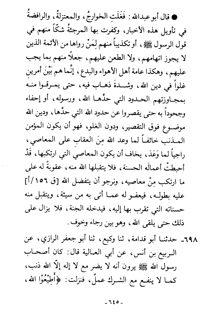 698 - حَدَّثَنَا أَبُو قُدَامَةَ، ثنا وَكِيعٌ، ثنا أَبُو جَعْفَرٍ الرَّازِيُّ، عَنِ الرَّبِيعِ بْنِ أَنَسٍ، عَنْ أَبِي الْعَالِيَةِ، قَالَ: " §كَانَ أَصْحَابُ رَسُولِ اللَّهِ صَلَّى اللهُ عَلَيْهِ وَسَلَّمَ يَرَوْنَ أَنَّهُ لَا يَضُرُّ مَعَ لَا إِلَهَ إِلَّا اللَّهُ ذَنْبٌ، كَمَا لَا يَنْفَعُ مَعَ الشِّرْكِ عَمَلٌ، فَنَزَلَتْ: {أَطِيعُوا اللَّهَ وَأَطِيعُوا الرَّسُولَ وَلَا تُبْطِلُوا أَعْمَالَكُمْ} [محمد: 33] فَخَافُوا أَنْ يُبْطِلَ الذَّنْبُ الْعَمَلَ "
