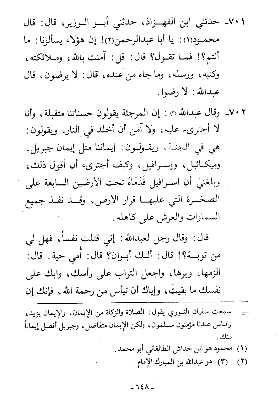 702 - وَقَالَ عَبْدُ اللَّهِ إِنَّ الْمُرْجِئَةَ يَقُولُونَ: حَسَنَاتُنَا مُتَقَبَّلَةٌ وَأَنَا لَا أَجْتَرِئُ عَلَيْهِ، وَلَا آمَنُ أَنْ أُخَلَّدَ فِي النَّارِ، وَيَقُولُونَ هِيَ فِي الْجَنَّةِ، وَيَقُولُونَ: إِيمَانُنَا مِثْلُ إِيمَانِ جِبْرِيلَ، وَمِيكَائِيلَ، وَإِسْرَافِيلَ كَيْفَ أَجْتَرِئُ أَنْ أَقُولَ مِثْلَ ذَلِكَ، وَبَلَغَنِي أَنَّ إِسْرَافِيلَ قَدَمَاهُ تَحْتَ الْأَرَضِينَ السَّابِعَةِ عَلَى الصَّخْرَةِ الَّتِي عَلَيْهَا قَرَارُ الْأَرْضِ، وَقَدْ نَفَذَ جَمِيعُ السَّمَاوَاتِ وَالْعَرْشِ عَلَى كَاهِلِهِ قَالَ: وَقَالَ رَجُلٌ لِعَبْدِ اللَّهِ: إِنِّي قَتَلْتُ نَفْسًا فَهَلْ لِي مِنْ تَوْبَةٍ؟ قَالَ: أَلَكَ أَبَوَانِ؟ قَالَ: أُمِّي حَيَّةٌ، قَالَ: الْزَمْهَا وَبِرَّهَا، وَاجْعَلِ التُّرَابَ عَلَى رَأْسِكَ، وَابْكِ عَلَى نَفْسِكَ مَا بَقِيتَ، وَإِيَّاكَ أَنْ تَيْأَسَ مِنْ رَحْمَةِ اللَّهِ فَإِنَّكَ إِنْ -[649]- أَيِسْتَ مِنْ رَحْمَةِ اللَّهِ كَانَ أَعْظَمَ عَلَيْكَ مِنْ هَذَا الذَّنْبِ الَّذِي رَكِبْتَهُ.