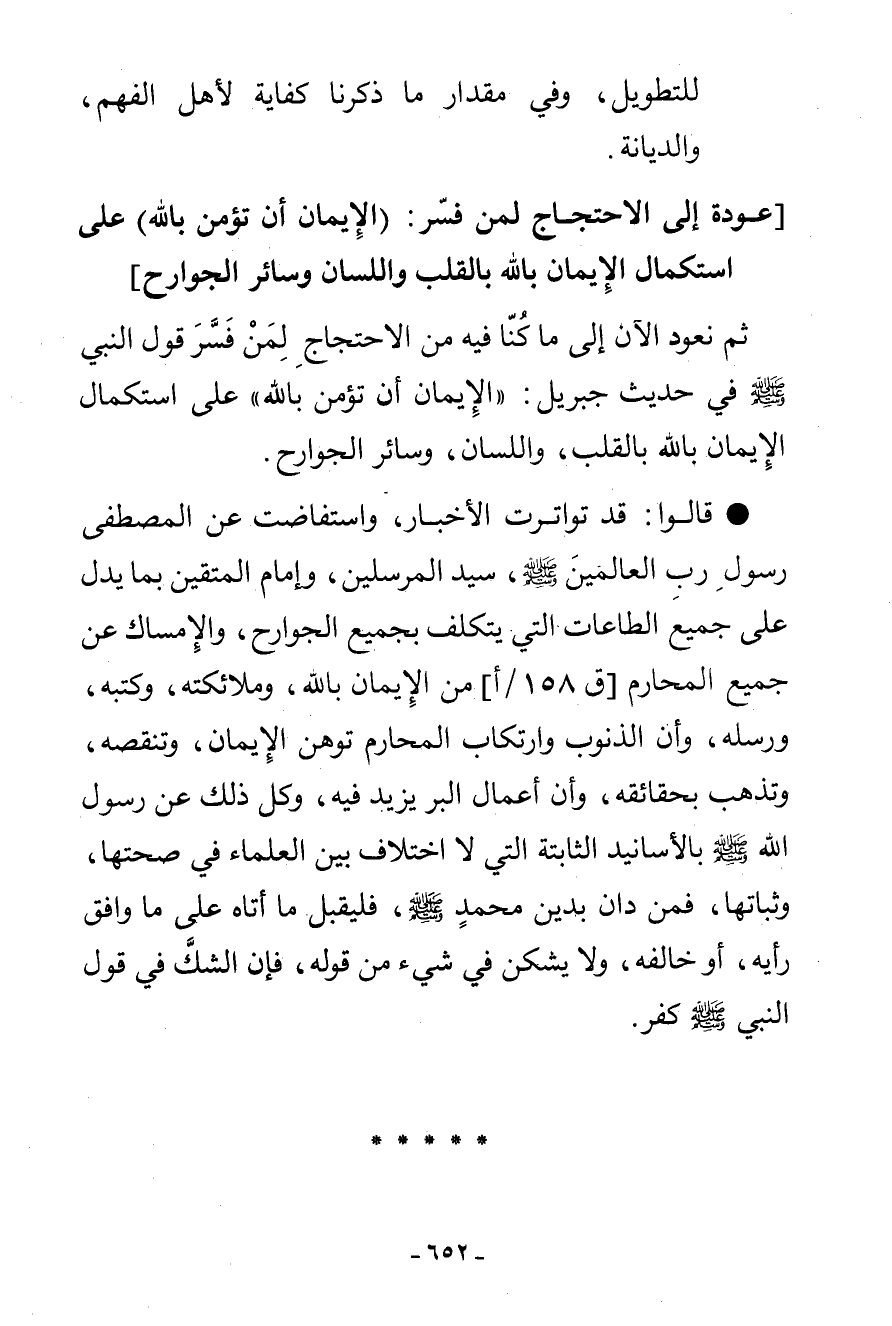 §عَوْدَةٌ إِلَى الِاحْتِجَاجِ لِمَنْ فَسَّرَ: «الْإِيمَانُ أَنْ تُؤْمِنَ بِاللَّهِ» عَلَى اسْتِكْمَالِ الْإِيمَانِ بِاللَّهِ بِالْقَلْبِ وَاللِّسَانِ وَسَائِرِ الْجَوَارِحِ. ثُمَّ نَعُودُ الْآنَ إِلَى مَا كُنَّا فِيهِ مِنَ الِاحْتِجَاجِ لِمَنْ فَسَّرَ قَوْلَ النَّبِيِّ صَلَّى اللهُ عَلَيْهِ وَسَلَّمَ فِي حَدِيثِ جِبْرِيلَ: «الْإِيمَانُ أَنْ تُؤْمِنَ بِاللَّهِ» عَلَى اسْتِكْمَالِ الْإِيمَانِ بِاللَّهِ بِالْقَلْبِ وَاللِّسَانِ وَسَائِرِ الْجَوَارِحِ، قَالُوا: قَدْ تَوَاتَرَتِ الْأَخْبَارُ، وَاسْتَفَاضَتْ عَنِ الْمُصْطَفَى رَسُولِ رَبِّ الْعَالَمِينَ صَلَّى اللهُ عَلَيْهِ وَسَلَّمَ سَيِّدِ الْمُرْسَلِينَ وَإِمَامِ الْمُتَّقِينَ بِمَا يَدُلُّ عَلَى جَمِيعِ الطَّاعَاتِ الَّتِي يُتَكَلَّفُ بِجَمِيعِ الْجَوَارِحِ، وَالْإِمْسَاكِ عَنْ جَمِيعِ الْمَحَارِمِ مِنَ الْإِيمَانِ بِاللَّهِ، وَمَلَائِكَتِهِ، وَكُتُبِهِ، وَرُسُلِهِ، وَأَنَّ الذُّنُوبَ وَارْتِكَابَ الْمَحَارِمِ تُوهِنُ الْإِيمَانَ وَتُنْقِصُهُ، وَتَذْهَبُ بِحَقَائِقِهِ، وَأَنَّ أَعْمَالَ الْبِرِّ يَزِيدُ فِيهِ، وَكُلُّ ذَلِكَ عَنْ رَسُولِ اللَّهِ صَلَّى اللهُ عَلَيْهِ وَسَلَّمَ بِالْأَسَانِيدِ الثَّابِتَةِ الَّتِي لَا اخْتِلَافَ بَيْنَ الْعُلَمَاءِ فِي صِحَّتِهَا وَثَبَاتِهَا، فَمَنْ دَانَ بِدِينِ مُحَمَّدٍ صَلَّى اللهُ عَلَيْهِ وَسَلَّمَ فَلْيَقْبَلْ مَا أَتَاهُ عَلَى مَا وَافَقَ رَأْيَهُ أَوْ خَالَفَهُ، وَلَا يَشُكَّنَّ فِي شَيْءٍ مِنْ قَوْلِهِ، فَإِنَّ الشَّكَّ فِي قَوْلِ النَّبِيِّ صَلَّى اللهُ عَلَيْهِ وَسَلَّمَ كُفْرٌ