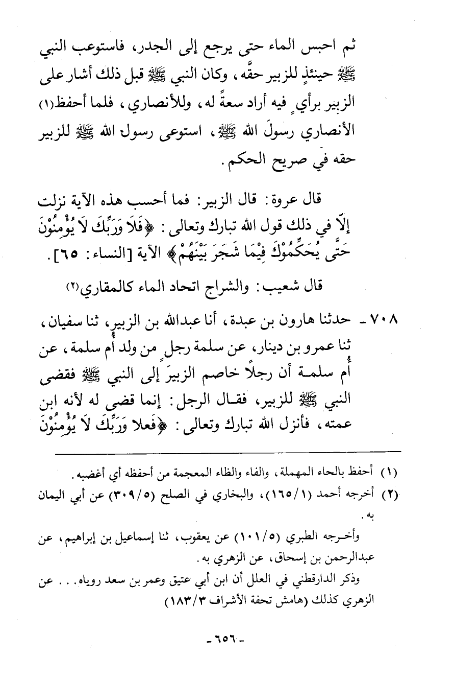 708 - حَدَّثَنَا هَارُونُ بْنُ عَبْدَةَ، أنا عَبْدُ اللَّهِ بْنُ الزُّبَيْرِ، ثنا سُفْيَانُ، ثنا عَمْرُو بْنُ دِينَارٍ، عَنْ سَلَمَةَ، رَجُلٍ مِنْ وَلَدِ أُمِّ سَلَمَةَ، عَنْ أُمِّ سَلَمَةَ، §أَنَّ رَجُلًا، خَاصَمَ الزُّبَيْرَ إِلَى النَّبِيِّ صَلَّى اللهُ عَلَيْهِ وَسَلَّمَ فَقَضَى النَّبِيُّ صَلَّى اللهُ عَلَيْهِ وَسَلَّمَ لِلزُّبَيْرِ فَقَالَ الرَّجُلُ: إِنَّمَا قَضَى لَهُ لِأَنَّهُ ابْنُ عَمَّتِهِ فَأَنْزَلَ اللَّهُ تَبَارَكَ وَتَعَالَى: {فَلَا وَرَبِّكَ لَا يُؤْمِنُونَ حَتَّى يُحَكِّمُوكَ} [النساء: 65] الْآيَةَ "