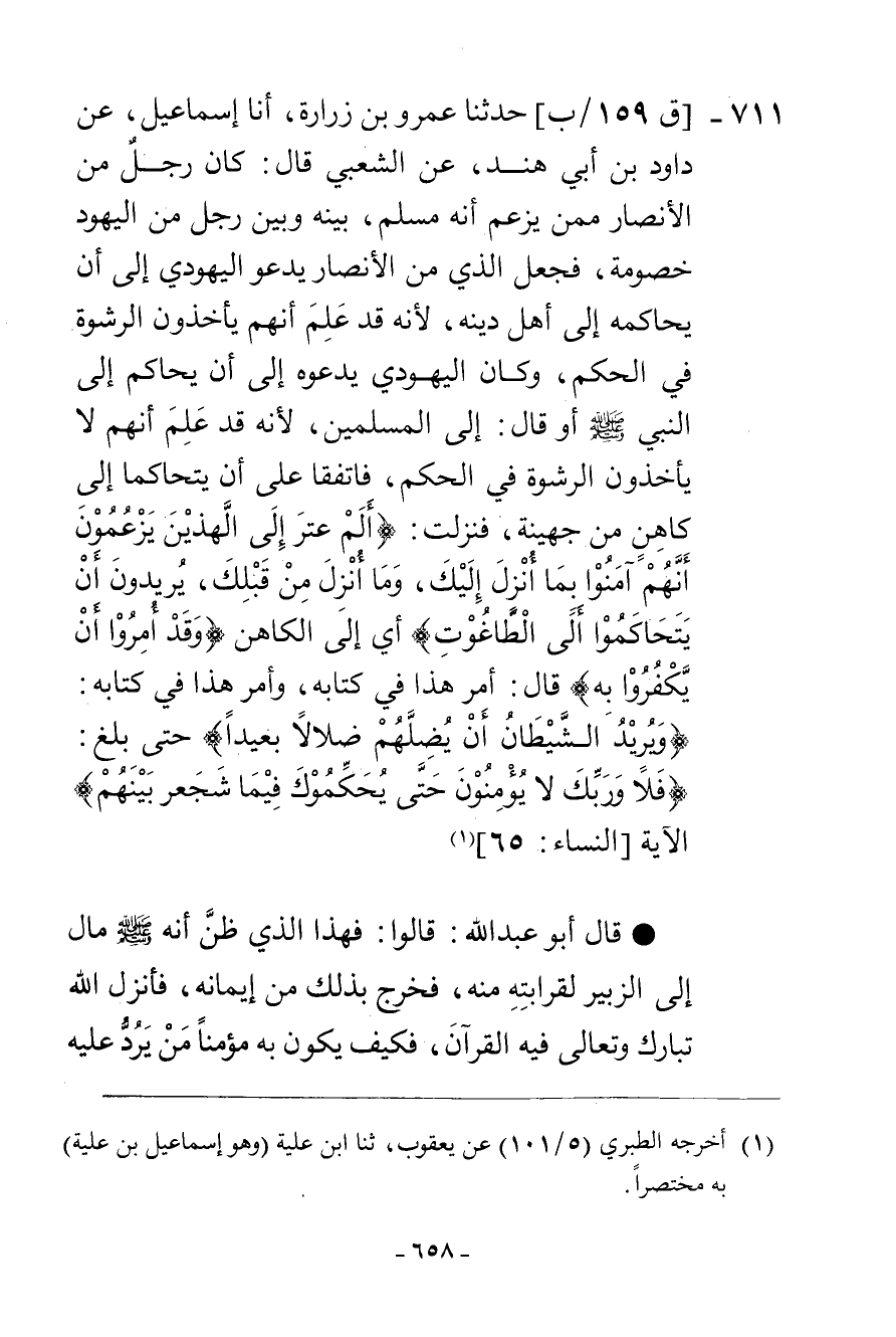 711 - حَدَّثَنَا عَمْرُو بْنُ زُرَارَةَ، أنا إِسْمَاعِيلُ، عَنْ دَاوُدَ بْنِ أَبِي هِنْدَ، عَنِ الشَّعْبِيِّ، قَالَ: " §كَانَ رَجُلٌ مِنَ الْأَنْصَارِ مِمَّنْ يَزْعُمُ أَنَّهُ مُسْلِمٌ بَيْنَهُ وَبَيْنَ رَجُلٍ مِنَ الْيَهُودِ خُصُومَةٌ، فَجَعَلَ الَّذِي مِنَ الْأَنْصَارِ يَدْعُو الْيَهُودِيَّ إِلَى أَنْ يُحَاكِمَهُ إِلَى أَهْلِ دِينِهِ، لِأَنَّهُ قَدْ عَلِمَ أَنَّهُمْ يَأْخُذُونَ الرِّشْوَةَ فِي الْحُكْمِ وَكَانَ الْيَهُودِيُّ يَدْعُوهُ إِلَى أَنْ يُحَاكَمَ إِلَى النَّبِيِّ صَلَّى اللهُ عَلَيْهِ وَسَلَّمَ أَوْ قَالَ: إِلَى الْمُسْلِمِينَ لِأَنَّهُ قَدْ عَلِمَ أَنَّهُمْ لَا يَأْخُذُونَ الرِّشْوَةَ فِي الْحُكْمِ فَاتَّفَقَا عَلَى أَنْ يَتَحَاكَمَا إِلَى كَاهِنٍ مِنْ جُهَيْنَةَ فَنَزَلَتْ: {أَلَمْ تَرَ إِلَى الَّذِينَ يَزْعُمُونَ أَنَّهُمْ آمَنُوا بِمَا أُنْزِلَ إِلَيْكَ وَمَا أُنْزِلَ مِنْ قَبْلِكَ يُرِيدُونَ أَنْ يَتَحَاكَمُوا إِلَى الطَّاغُوتِ} [النساء: 60] أَيْ إِلَى الْكَاهِنِ {وَقَدْ أُمِرُوا أَنْ يَكْفُرُوا بِهِ} [النساء: 60] قَالَ: أَمْرُ هَذَا فِي كِتَابِهِ، وَأَمْرُ هَذَا فِي كِتَابِهِ، {وَيُرِيدُ الشَّيْطَانُ أَنْ يُضِلَّهُمْ ضَلَالًا بَعِيدًا} [النساء: 60] حَتَّى بَلَغَ: {فَلَا وَرَبِّكَ لَا يُؤْمِنُونَ حَتَّى يُحَكِّمُوكَ فِيمَا شَجَرَ بَيْنَهُمْ} [النساء: 65] الْآيَةَ ". قَالَ أَبُو عَبْدِ اللَّهِ: قَالُوا: فَهَذَا الَّذِي ظَنَّ أَنَّهُ صَلَّى اللهُ عَلَيْهِ وَسَلَّمَ مَالَ إِلَى الزُّبَيْرِ لِقَرَابَتِهِ مِنْهُ فَخَرَجَ بِذَلِكَ مِنْ إِيمَانِهِ، فَأَنْزَلَ اللَّهُ تَبَارَكَ وَتَعَالَى فِيهِ الْقُرْآنَ، فَكَيْفَ يَكُونُ بِهِ مُؤْمِنًا مَنْ يَرُدُّ عَلَيْهِ -[659]- السُّنَّةَ الثَّابِتَةَ الْمَعْرُوفَةَ بِرَأْيهِ أَوْ بِرَأْيِ أَحَدٍ مِنَ النَّاسِ بَعْدَهُ تَعَمُّدًا لِذَلِكَ أَوْ شَكًّا فِيهَا، أَوْ إِنْكَارًا لَهَا حِينَ لَمْ تُوَافِقْ هَوَاهُ، ثُمَّ يَزْعُمُ أَنَّهُ مُؤْمِنٌ عِنْدَ اللَّهِ، مُسْتَكْمِلُ الْإِيمَانِ مِنْ ثَابِتَةِ الْأَخْبَارِ الَّتِي رَوَتْهَا عُلَمَاءُ الْأُمَّةِ بِالْأَسَانِيدِ الثَّابِتَةِ عَنْ رَسُولِ صَلَّى اللهُ عَلَيْهِ وَسَلَّمَ أَنَّهُ جَعَلَ الْعَمَلَ مِنَ الْإِيمَانِ فَيَقُولُ: هُوَ لَيْسَ كَذَلِكَ جُحُودًا بِذَلِكَ أَوْ شَكًّا فِيهِ أَوْ كَيْفَ يَكُونُ بِهِ مُؤْمِنًا مَنْ يَأْتِيَهُ الْخَبَرُ الثَّابِتُ عَنْ رَسُولِ اللَّهِ صَلَّى اللهُ عَلَيْهِ وَسَلَّمَ أَنَّهُ أَمَرَ بِكَذَا أَوْ نَهَى عَنْ كَذَا، فَيَقُولُ: قَالَ أَبُو فُلَانٍ كَذَا خِلَافًا عَلَى رَسُولِ اللَّهِ صَلَّى اللهُ عَلَيْهِ وَسَلَّمَ وَرَدًّا لِسُنَّتِهِ أَمْ كَيْفَ يَكُونُ بِهِ مُؤْمِنًا مِنْ تُعْرَضُ سُنَّتُهُ عَلَى رَأْيِهِ فَمَا وَافَقَ مِنْهَا قَبِلَ، وَمَا لَمْ يُوَافِقُهُ مِنْهَا احْتَالَ لِرَدِّهَا أَلَا يَنْظُرُ الشَّقِيُّ عَلَى مَنِ اجْتَرَأَ وَبَيْنَ يَدَيْ مَنْ تَقَدَّمَ؟ . قَالَ اللَّهُ تَبَارَكَ وَتَعَالَى: {يَا أَيُّهَا الَّذِينَ آمَنُوا لَا تُقَدِّمُوا بَيْنَ يَدَيِ اللَّهِ وَرَسُولِهِ وَاتَّقُوا اللَّهَ إِنَّ اللَّهَ سُمَيْعٌ عَلِيمٌ يَا أَيُّهَا الَّذِينَ آمَنُوا لَا تَرْفَعُوا أَصْوَاتَكُمْ فَوْقَ صَوْتِ النَّبِيِّ وَلَا تَجْهَرُوا لَهُ بِالْقَوْلِ كَجَهْرِ بَعْضِكُمْ لِبَعْضٍ أَنْ تَحْبَطَ أَعْمَالُكُمْ وَأَنْتُمْ لَا تَشْعُرُونَ} [الحجرات: 2]