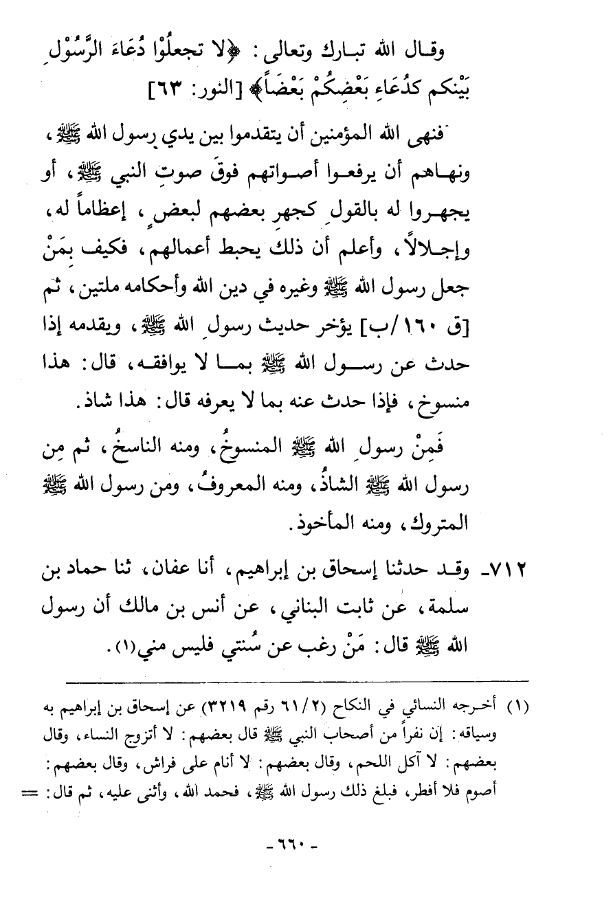 712 - وَقَدْ حَدَّثَنَا إِسْحَاقُ بْنُ إِبْرَاهِيمَ، أنا عَفَّانُ، ثنا حَمَّادُ بْنُ سَلَمَةَ، عَنْ ثَابِتٍ الْبُنَانِيِّ، عَنْ أَنَسِ بْنِ مَالِكٍ، أَنَّ رَسُولَ اللَّهِ صَلَّى اللهُ عَلَيْهِ وَسَلَّمَ قَالَ: «§مَنْ رَغِبَ عَنْ سُنَّتِي فَلَيْسَ مِنِّي.»