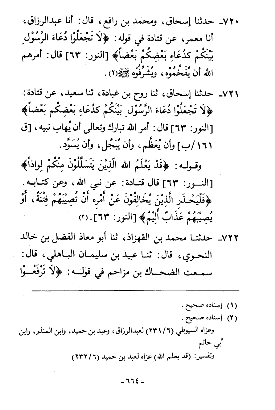 720 - حَدَّثَنَا إِسْحَاقُ، وَمُحَمَّدُ بْنُ رَافِعٍ، قَالَ: أنا عَبْدُ الرَّزَّاقِ، أنا مَعْمَرٌ، عَنْ قَتَادَةَ، فِي قَوْلِهِ: " {§لَا تَجْعَلُوا دُعَاءَ الرَّسُولِ بَيْنَكُمْ كَدُعَاءِ بَعْضِكُمْ بَعْضًا} [النور: 63] قَالَ: أَمَرَهُمُ اللَّهُ أَنْ يُفَخِّمُوهُ وَيُشَرِّفُوهُ صَلَّى اللهُ عَلَيْهِ وَسَلَّمَ "