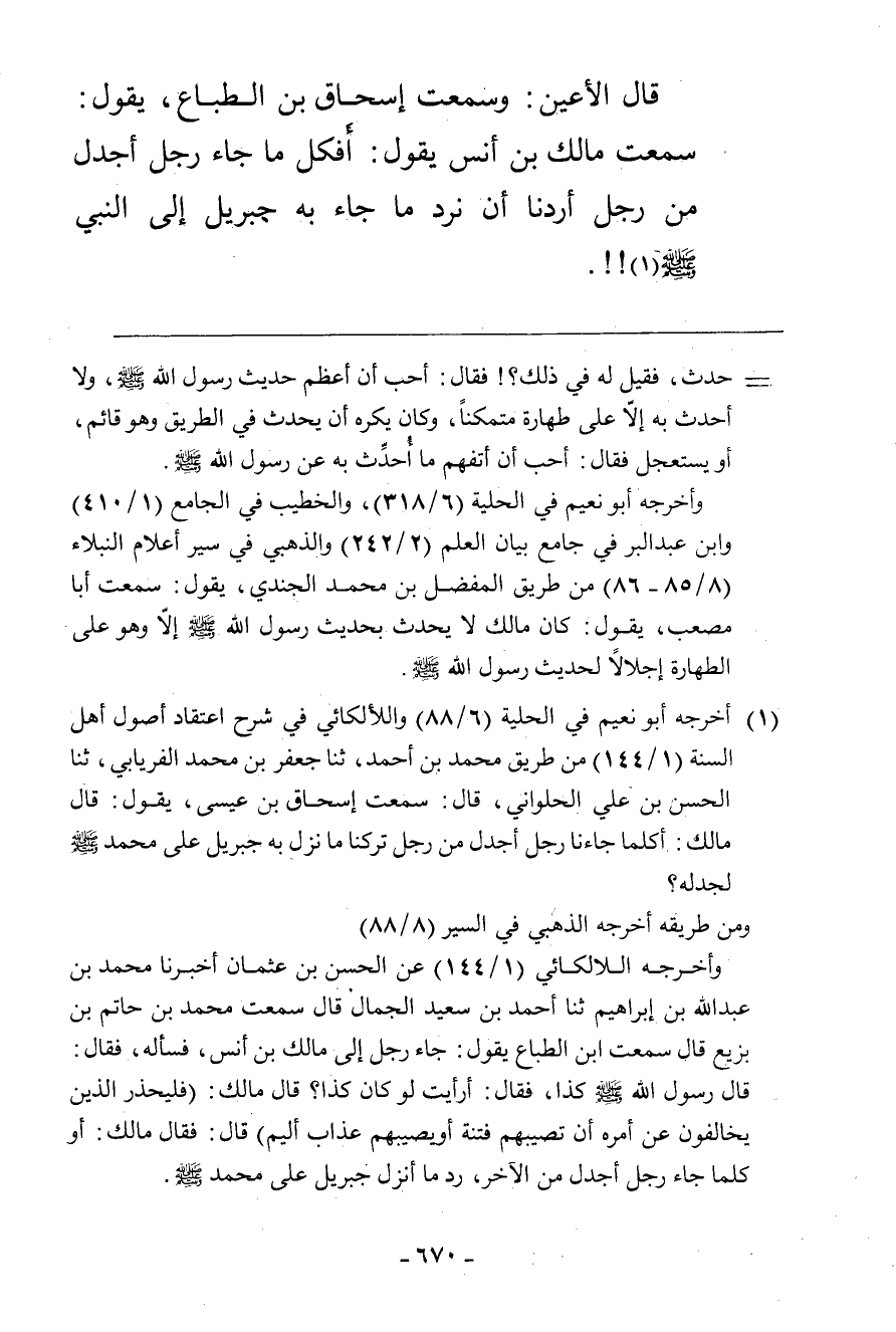 قَالَ الْأَعْيَنُ: وَسَمِعْتُ إِسْحَاقَ بْنَ الطَّبَّاعِ يَقُولُ: سَمِعْتُ مَالِكَ بْنَ أَنَسٍ يَقُولُ: «§أَفَكُلُّ مَا جَاءَ رَجُلٌ أَجْدَلُ مِنْ رَجُلٍ أَرَدْنَا أَنْ نَرُدَّ مَا جَاءَ بِهِ جِبْرِيلُ إِلَى النَّبِيِّ صَلَّى اللهُ عَلَيْهِ وَسَلَّمَ»
