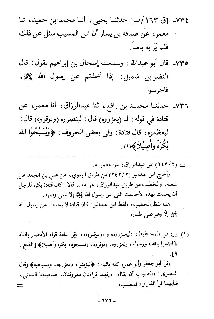 736 - حَدَّثَنَا مُحَمَّدُ بْنُ رَافِعٍ، ثنا عَبْدُ الرَّزَّاقِ، أنا مَعْمَرٌ، عَنْ قَتَادَةَ، " §فِي قَوْلِهِ: (لِيُعَزِّرُوهُ) قَالَ: لِيَنْصُرُوهُ (وَيُوَقِّرُوهُ) ، قَالَ: لِيُعَظِّمُوهُ، قَالَ قَتَادَةُ: وَفِي بَعْضِ الْحُرُوفِ: (وَيُسَبِّحُوا اللَّهَ بُكْرَةً وَأَصِيلًا) "