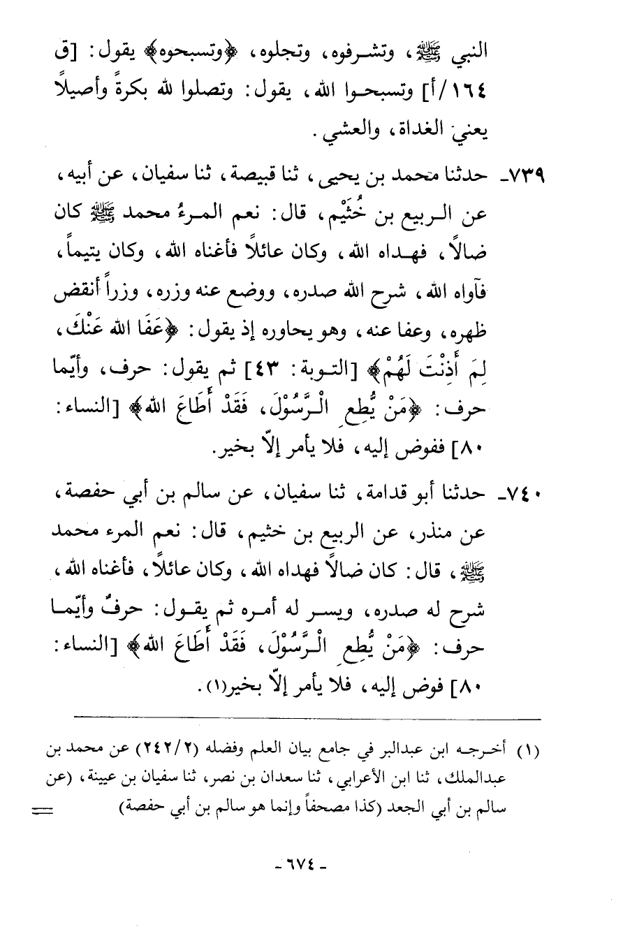 739 - حَدَّثَنَا مُحَمَّدُ بْنُ يَحْيَى، ثنا قَبِيصَةُ، ثنا سُفْيَانُ، عَنْ أَبِيهِ، عَنِ الرَّبِيعِ بْنِ خُثَيْمٍ، قَالَ: §نِعْمَ الْمَرْءُ مُحَمَّدٌ صَلَّى اللهُ عَلَيْهِ وَسَلَّمَ كَانَ ضَالًّا فَهَدَاهُ اللَّهُ، وَكَانَ عَائِلًا فَأَغْنَاهُ اللَّهُ، وَكَانَ يَتِيمًا فَآوَاهُ اللَّهُ، شَرَحَ اللَّهُ صَدْرَهُ، وَوَضَعَ عَنْهُ وِزْرَهُ، وِزْرًا أَنْقَضَ ظَهْرَهُ، وَعَفَا عَنْهُ وَهُوَ يُحَاوِرُهُ إِذْ يَقُولُ: {عَفَا اللَّهُ عَنْكَ لِمَ أَذِنْتَ لَهُمْ} [التوبة: 43] ثُمَّ يَقُولُ حَرْفٌ، وَأَيُّمَا حَرْفٌ: {مَنْ يُطِعِ الرَّسُولَ فَقَدْ أَطَاعَ اللَّهَ} [النساء: 80] فَفَوَّضَ إِلَيْهِ فَلَا يَأْمُرُ إِلَّا بِخَيْرٍ "