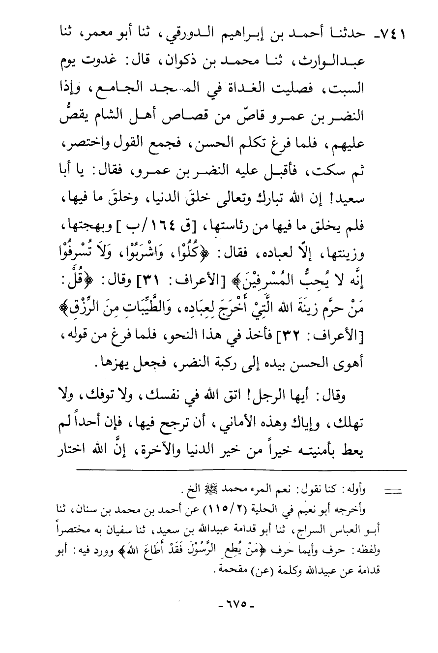 741 - حَدَّثَنَا أَحْمَدُ بْنُ إِبْرَاهِيمَ الدَّوْرَقِيُّ، ثنا أَبُو مَعْمَرٍ، ثنا عَبْدُ الْوَارِثِ، ثنا مُحَمَّدُ بْنُ ذَكْوَانَ، قَالَ: " §غَدَوْتُ يَوْمَ السَّبْتِ فَصَلَّيْتُ الْغَدَاةَ فِي الْمَسْجِدِ الْجَامِعِ، وَإِذَا النَّضْرُ بْنُ عَمْرٍو قَاصٌّ مِنْ قَصَّاصِ أَهْلِ الشَّامِ يَقُصُّ عَلَيْهِمْ، فَلَمَّا فَرَغَ تَكَلَّمَ الْحَسَنُ فَجَمَعَ الْقَوْلَ وَاخْتَصَرَ، ثُمَّ سَكَتَ فَأَقْبَلَ عَلَيْهِ النَّضْرُ بْنُ عَمْرٍو فَقَالَ: يَا أَبَا سَعِيدٍ إِنَّ اللَّهَ تَبَارَكَ وَتَعَالَى خَلَقَ الدُّنْيَا، وَخَلَقَ مَا فِيهَا، فَلَمْ يَخْلُقْ مَا فِيهَا مِنْ رِئَاسَتِهَا، وَبَهْجَتِهَا، وَزِينَتِهَا إِلَّا لِعِبَادِهِ، فَقَالَ: {كُلُوا وَاشْرَبُوا وَلَا تُسْرِفُوا إِنَّهُ لَا يُحِبُّ الْمُسْرِفِينَ} [الأعراف: 31] ، وَقَالَ: {قُلْ مَنْ حَرَّمَ زِينَةَ اللَّهِ الَّتِي أَخْرَجَ لِعِبَادِهِ وَالطَّيِّبَاتِ مِنَ الرِّزْقِ} [الأعراف: 32] فَأَخَذَ فِي هَذَا النَّحْوِ فَلَمَّا فَرَغَ مِنْ قَوْلِهِ أَهْوَى الْحَسَنُ بِيَدِهِ إِلَى رُكْبَةِ النَّضْرِ فَجَعَلَ يَهُزَّهَا وَقَالَ: أَيُّهَا الرَّجُلُ اتَّقِ اللَّهَ فِي نَفْسِكَ، وَلَا تُوفِكْ وَلَا تُهْلِكْ، وَإِيَّاكَ وَهَذِهِ الْأَمَانِيَّ أَنْ تَرْجَحَ فِيهَا فَإِنَّ أَحَدًا لَمْ يُعْطَ بِأُمْنِيَتِهِ خَيْرًا مِنْ خَيْرِ الدُّنْيَا وَالْآخِرَةِ، إِنَّ اللَّهَ اخْتَارَ -[676]- نَبِيَّكُمْ صَلَّى اللهُ عَلَيْهِ وَسَلَّمَ لِنَفْسِهِ، وَبَعَثَهُ بِرِسَالَاتِهِ، وَجَعَلَهُ رَسُولًا إِلَى خَلْقِهِ، ثُمَّ أَنْزَلَ عَلَيْهِ كِتَابَهُ، ثُمَّ وَضَعَهُ مِنَ الدُّنْيَا مَوْضِعًا، وَقَوَّتَ لَهُ فِيهَا قُوتًا، حَتَّى إِذَا نَظَرَ أَهْلُ الدُّنْيَا إِلَى مَكَانِهِ مِنَ الدُّنْيَا، وَمَكَانِ الدُّنْيَا مِنْهُ قَالَ: {لَقَدْ كَانَ لَكُمْ فِي رَسُولِ اللَّهِ أُسْوَةٌ حَسَنَةٌ} [الأحزاب: 21] هَاهُنَا أَمَرَنَا أَنْ نَأْخُذَ بِأَمْرِهِ، وَأَنْ نَقْتَدِيَ بِهَدْيِهِ، وَأَنْ نَسْلُكَ طَرِيقَهُ، وَأَنْ نَعْمَلَ بِسُنَّتِهِ فَمَا بَلَغْنَا فَبِمَنِّ اللَّهِ وَرَحْمَتِهِ، وَمَا قَصَّرْنَا اسْتَغْفَرْنَا فَذَاكَ بَابُ مَخْرَجِنَا، فَأَمَّا الْأَمَانِيُّ فَلَا خَيْرَ فِيهَا، وَلَا فِي أَحَدٍ مِنْ أَهْلِهَا. قَالَ النَّضْرُ عِنْدَ ذَلِكَ: يَا أَبَا سَعِيدٍ وَاللَّهِ إِنَّا عَلَى مَا كَانَ فِينَا لَنُحِبُّ رَبَّنَا. قَالَ الْحَسَنُ: قَدْ قَالَ ذَلِكَ قَوْمٌ عَلَى عَهْدِ نَبِيِّكُمْ صَلَّى اللهُ عَلَيْهِ وَسَلَّمَ فَقَالُوا: يَا مُحَمَّدُ وَاللَّهِ إِنَّا لَنُحِبُّ رَبَّنَا، فَأَنْزَلَ اللَّهُ عَلَى نَبِيِّهِ: {قُلْ إِنْ كُنْتُمْ تُحِبُّونَ اللَّهَ فَاتَّبِعُونِي يُحْبِبْكُمُ اللَّهُ} [آل عمران: 31] فَجَعَلَ اللَّهُ اتِّبَاعَ سَنَةِ مُحَمَّدٍ صَلَّى اللهُ عَلَيْهِ وَسَلَّمَ عَلَمًا لِحُبِّهِ، وَأَكْذَبَ مَنْ خَالَفَهَا أَيُّهَا الرَّجُلُ: اتَّقِ اللَّهَ فِي نَفْسِكَ، فَإِنِّي قَدْ أَدْرَكْتُ أَقْوَامًا كَانُوا قَبْلَكَ فِي صَدْرِ هَذِهِ الْأُمَّةِ كَانُوا مُوَافِقِينَ لِكِتَابِ رَبِّهِمْ، وَلِسُنَّةِ نَبِيِّهِمْ صَلَّى اللهُ عَلَيْهِ وَسَلَّمَ إِذَا جَنَّتْهُمُ اللَّيْلُ قِيَامًا عَلَى أَطْرَافِهِمْ يَفْتَرِشُونَ وُجُوهَهُمْ يُنَاجُونَ الَّذِي خَلَقَهُمْ فِي -[677]- فِكَاكِ رِقَابِهِمْ، إِنْ عَمِلُوا حَسَنَةً دَأَبُوا فِي شُكْرِهَا، وَسَأَلُوا اللَّهَ أَنْ يَتَقَبَّلَهَا، وَإِنْ عَمِلُوا سَيِّئَةً بَكَّتْهُمْ، وَسَأَلُوا اللَّهَ أَنْ يَغْفِرَهَا، إِذَا أَشْرَفَ لَهُمْ شَيْءٌ مِنَ الدُّنْيَا أَخَذُوا مِنْهُ قُوتَهُمْ، وَوَضَعُوا الْعَقْلَ مَعَادَهُمْ وَإِنْ زَوَى عَنْهُمْ قَالُوا: هَذَا نَظَرٌ مِنَ اللَّهِ وَخِيَارٌ فَكَانُوا كَذَلِكَ، وَعَلَى ذَلِك
