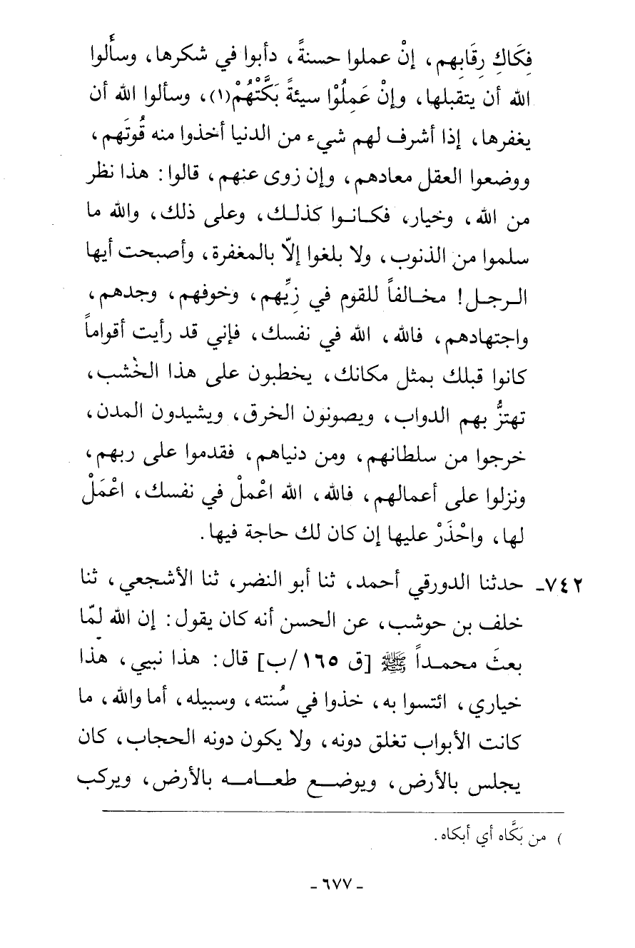 742 - حَدَّثَنَا الدَّوْرَقِيُّ أَحْمَدُ، ثنا أَبُو النَّضْرِ، ثنا الْأَشْجَعِيُّ، ثنا خَلَفُ بْنُ حَوْشَبٍ، عَنِ الْحَسَنِ، أَنَّهُ كَانَ يَقُولُ: " إِنَّ §اللَّهَ لَمَّا بَعَثَ مُحَمَّدًا صَلَّى اللهُ عَلَيْهِ وَسَلَّمَ قَالَ: هَذَا نَبِيِّي، هَذَا خِيَارِي ائْتَسُوا بِهِ خُذُوا فِي سُنَّتِهِ وَسَبِيلِهِ، أَمَا وَاللَّهِ مَا كَانَتِ الْأَبْوَابُ تُغْلَقُ دُونَهُ، وَلَا يَكُونُ دُونَهُ الْحِجَابُ كَانَ يَجْلِسُ بِالْأَرْضِ، وَيُوضَعُ طَعَامُهُ بِالْأَرْضِ، وَيَرْكَبُ الْحِمَارَ، وَيَرْدِفُ خَلْفَهُ، وَكَان - وَاللَّهِ - يَلْعَقُ يَدَهُ، وَلَمْ يَكُنْ يُغْدَى عَلَيْهِ وَيُرَاحُ بِالْجِفَانِ، وَكَانَ يَقُولُ: «مَنْ رَغِبَ عَنْ سُنَّتِي فَلَيْسَ مِنِّي» فَمَا أَكْثَرَ التَّارِكِينَ لِسُنَّةِ رَسُولِ اللَّهِ صَلَّى اللهُ عَلَيْهِ وَسَلَّمَ وَمَا أَكْثَرَ الرَّاغِبِينَ عَنْهَا "