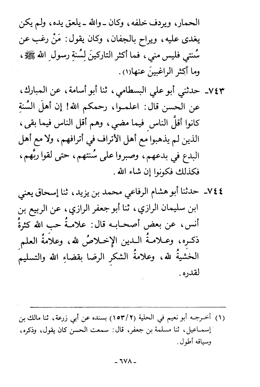 743 - حَدَّثَنِي أَبُو عَلِيٍّ الْبِسْطَامِيُّ، ثنا أَبُو أُسَامَةَ، عَنِ الْمُبَارَكِ، عَنِ الْحَسَنِ، قَالَ: «§اعْلَمُوا رَحِمَكُمُ اللَّهُ أَنَّ أَهْلَ السُّنَّةِ كَانُوا أَقَلَّ النَّاسِ فِيمَا مَضَى، وَهُمْ أَقَلُّ النَّاسِ فِيمَا بَقَى، الَّذِينَ لَمْ يَذْهَبُوا مَعَ أَهْلِ الْأَتْرَافِ فِي أَتْرَافِهِمْ، وَلَا مَعَ أَهْلِ الْبِدَعِ فِي بِدَعِهِمْ، وَصَبَرُوا عَلَى سُنَّتِهِمْ حَتَّى لَقُوا رَبَّهُمْ فَكَذَلِكَ فَكُونُوا إِنْ شَاءَ اللَّهُ»