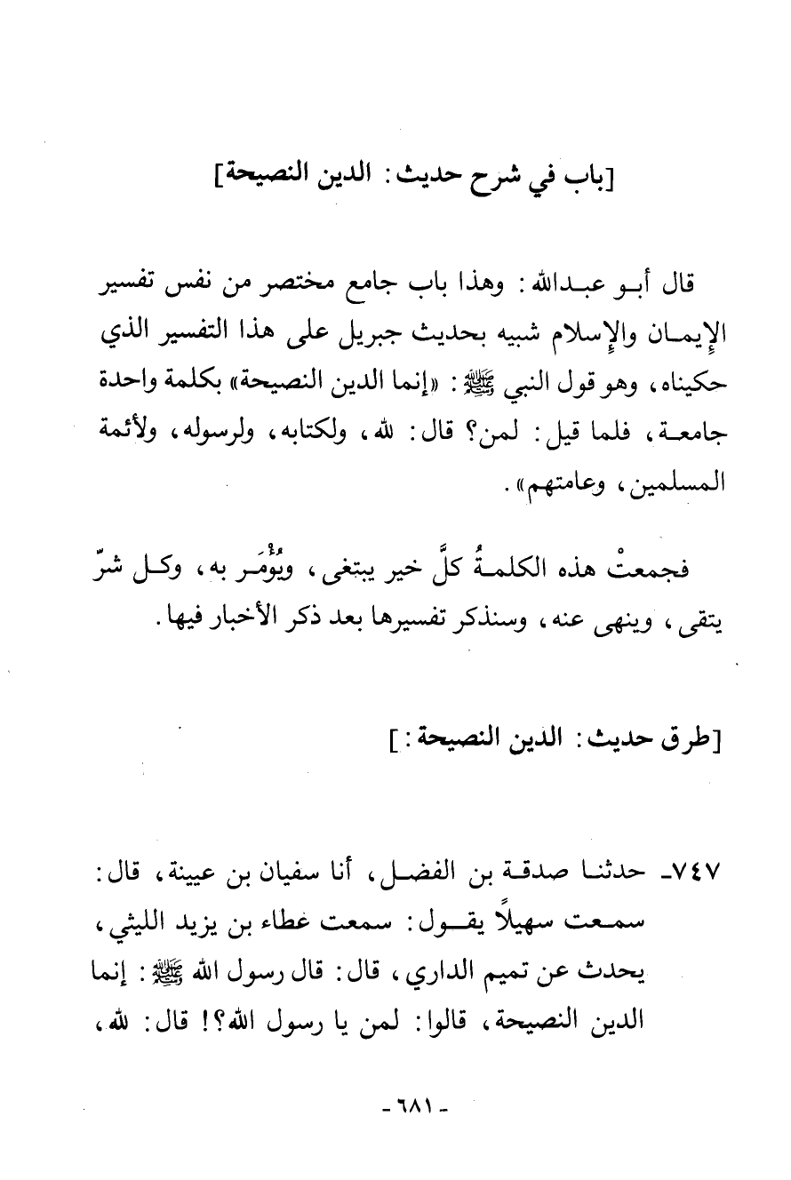 747 - حَدَّثَنَا صَدَقَةُ بْنُ الْفَضْلِ، أنا سُفْيَانُ بْنُ عُيَيْنَةَ، قَالَ: سَمِعْتُ سُهَيْلًا، يَقُولُ: سَمِعْتُ عَطَاءَ بْنَ يَزِيدَ اللَّيْثِيَّ، يُحَدِّثُ عَنْ تَمِيمٍ الدَّارِيِّ، قَالَ: قَالَ رَسُولُ اللَّهِ صَلَّى اللهُ عَلَيْهِ وَسَلَّمَ: «§إِنَّمَا الدِّينُ النَّصِيحَةُ» ، قَالُوا: لِمَنْ يَا رَسُولَ اللَّهِ؟ قَالَ: «لِلَّهِ، وَلِرَسُولِهِ، وَلِكِتَابِهِ، وَأَئِمَّةِ الْمُسْلِمِينَ وَعَامَّتِهِمْ»