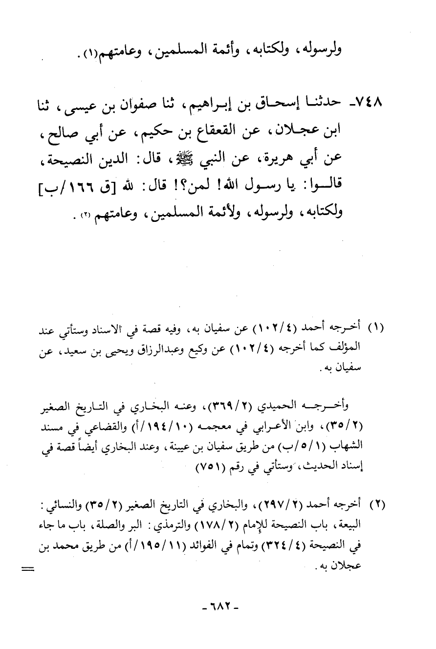 748 - حَدَّثَنَا إِسْحَاقُ بْنُ إِبْرَاهِيمَ، ثنا صَفْوَانُ بْنُ عِيسَى، ثنا ابْنُ عَجْلَانَ، عَنِ الْقَعْقَاعِ بْنِ حَكِيمٍ، عَنْ أَبِي صَالِحٍ، عَنْ أَبِي هُرَيْرَةَ، عَنِ النَّبِيِّ صَلَّى اللهُ عَلَيْهِ وَسَلَّمَ قَالَ: «§الدِّينُ النَّصِيحَةُ» قَالُوا: يَا رَسُولَ اللَّهِ لِمَنْ؟ قَالَ: «لِلَّهِ، وَلِكِتَابِهِ، وَلِرَسُولِهِ، وَلِأَئِمَّةِ الْمُسْلِمِينَ وَعَامَّتِهِمْ»