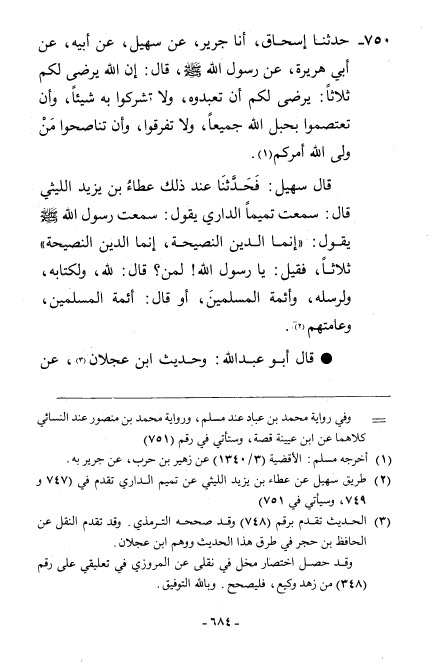 750 - حَدَّثَنَا إِسْحَاقُ، أنا جَرِيرٌ، عَنْ سُهَيْلٍ، عَنْ أَبِيهِ، عَنْ أَبِي هُرَيْرَةَ، عَنْ رَسُولِ اللَّهِ صَلَّى اللهُ عَلَيْهِ وَسَلَّمَ قَالَ: «إِنَّ §اللَّهَ يَرْضَى لَكُمْ ثَلَاثًا يَرْضَى لَكُمْ أَنْ تَعْبُدُوهُ وَلَا تُشْرِكُوا بِهِ شَيْئًا، وَأَنْ تَعْتَصِمُوا بِحَبْلِ اللَّهِ جَمِيعًا وَلَا تَفَرَّقُوا، وَأَنْ تُنَاصِحُوا مَنْ وَلَّى اللَّهُ أَمَرَكُمْ»