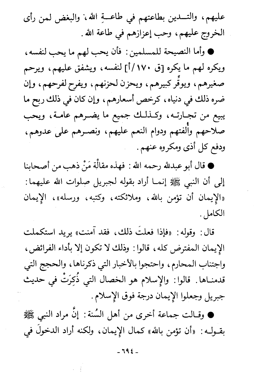 عَلَيْهِمْ، وَالتَّدَيُّنُ بِطَاعَتِهِمْ فِي طَاعَةِ اللَّهِ، وَالْبُغْضُ لِمَنْ رَأَى الْخُرُوجَ عَلَيْهِمْ وَحُبُّ إِعْزَازِهِمْ فِي طَاعَةِ اللَّهِ. وَأَمَّا النَّصِيحَةُ لِلْمُسْلِمِينَ: فَأَنْ يُحِبَّ لَهُمْ مَا يُحِبُّ لِنَفْسِهِ، وَيَكْرَهُ لَهُمْ مَا يَكْرَهُ لِنَفْسِهِ، وَيُشْفِقُ عَلَيْهِمْ وَيَرْحَمُ صَغِيرَهُمْ، وَيُوَقِّرُ كَبِيرَهُمْ، وَيَحْزَنُ لِحُزْنِهِمْ، وَيَفْرَحُ لِفَرَحِهِمْ، وَإِنْ ضَرَّهُ ذَلِكَ فِي دُنْيَاهُ كَرُخْصِ أَسْعَارِهِمْ، وَإِنْ كَانَ فِي ذَلِكَ رِبْحُ مَا يَبِيعُ مِنْ تِجَارَتِهِ، وَكَذَلِكَ جَمِيعُ مَا يَضُرُّهُمْ عَامَّةً وَيُحِبُّ صَلَاحَهُمْ، وَأُلْفَتَهُمْ، وَدَوَامَ النِّعَمِ عَلَيْهِمْ، وَنَصْرَهُمْ عَلَى عَدُوِّهِمْ، وَدَفْعَ كُلِّ أَذًى وَمَكْرُوهٍ عَنْهُمْ. قَالَ أَبُو عَبْدِ اللَّهِ رَحِمَهُ اللَّهُ: فَهَذِهِ مَقَالَةُ مَنْ ذَهَبَ مِنْ أَصْحَابِنَا إِلَى أَنَّ النَّبِيَّ صَلَّى اللهُ عَلَيْهِ وَسَلَّمَ إِنَّمَا أَرَادَ بِقَوْلِهِ لِجِبْرِيلَ صَلَوَاتُ اللَّهِ عَلَيْهِمَا: «الْإِيمَانُ أَنْ تُؤْمِنَ بِاللَّهِ، وَمَلَائِكَتِهِ، وَكُتُبِهِ، وَرُسُلِهِ» الْإِيمَانَ الْكَامِلَ. قَالَ: وَقَوْلُهُ: «فَإِذَا فَعَلْتَ ذَلِكَ فَقَدْ آمَنْتَ» يُرِيدُ اسْتَكْمَلْتَ الْإِيمَانَ الْمُفْتَرَضَ كُلَّهُ، قَالُوا: وَذَلِكَ لَا تَكُونُ إِلَّا بِأَدَاءِ الْفَرَائِضِ، وَاجْتِنَابِ الْمَحَارِمِ وَاحْتَجُّوا بِالْأَخْبَارِ الَّتِي ذَكَرْنَاهَا، وَالْحُجَجِ الَّتِي قَدَّمْنَاهَا، قَالُوا: وَالْإِسْلَامُ هُوَ الْخِصَالُ الَّتِي ذُكِرَتْ فِي حَدِيثِ جِبْرِيلَ، وَجَعَلُوا الْإِيمَانَ دَرَجَةً فَوْقَ الْإِسْلَامِ. وَقَالَتْ جَمَاعَةٌ أُخْرَى مِنْ أَهْلِ السُّنَّةِ: إِنَّ مُرَادَ النَّبِيِّ صَلَّى اللهُ عَلَيْهِ وَسَلَّمَ بِقَوْلِهِ: «أَنْ تُؤْمِنَ بِاللَّهِ» كَمَالُ الْإِيمَانِ، وَلَكِنَّهُ أَرَادَ الدُّخُولَ فِي