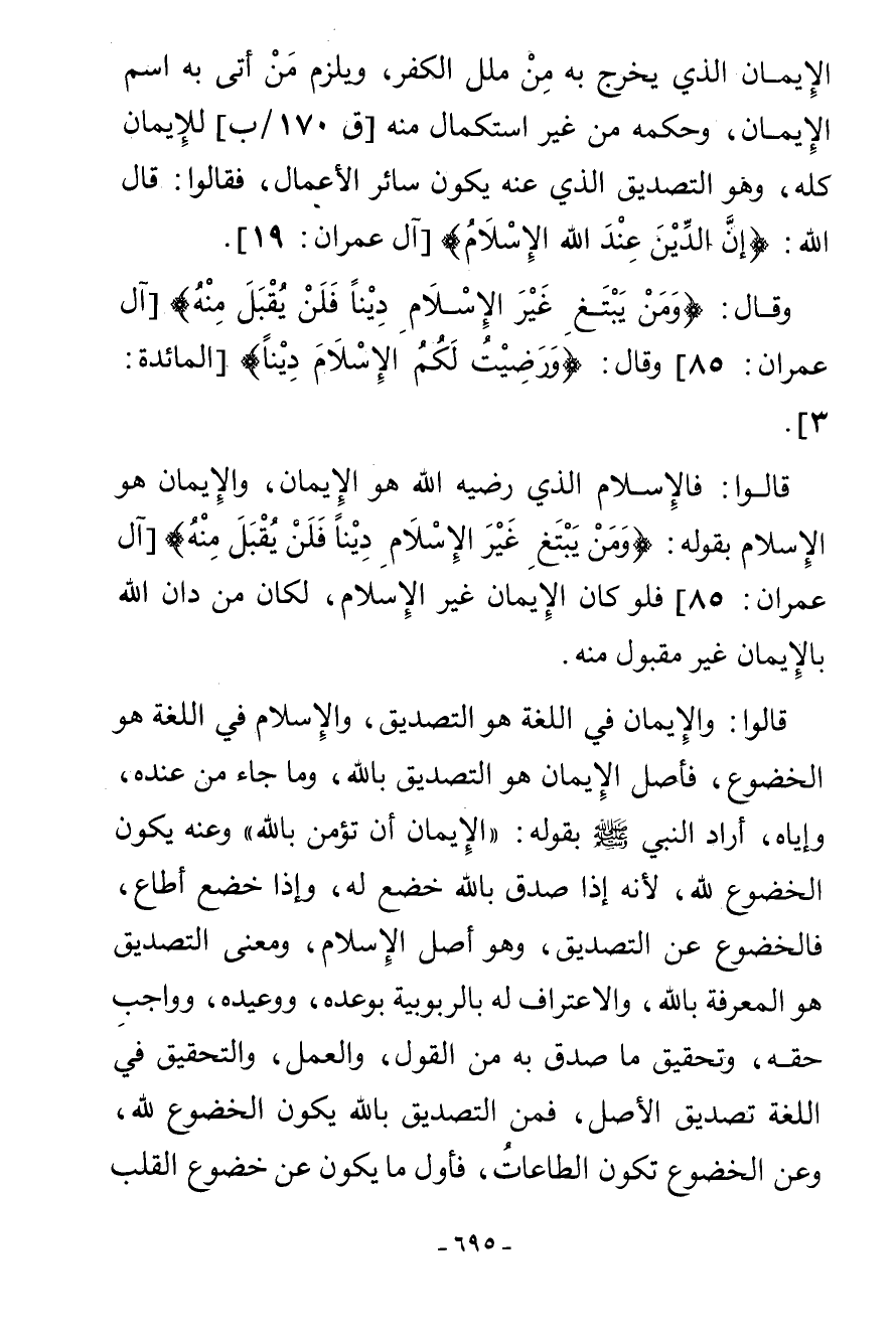 الْإِيمَانِ الَّذِي يَخْرُجُ بِهِ مِنْ مِلَلِ الْكُفْرِ وَيَلْزَمُ مَنْ أَتَى بِهِ اسْمُ الْإِيمَانِ، وَحُكْمُهُ مِنْ غَيْرِ اسْتِكْمَالٍ مِنْهُ لِلْإِيمَانِ كُلِّهِ، وَهُوَ التَّصْدِيقُ الَّذِي عَنْهُ يَكُونُ سَائِرُ الْأَعْمَالِ، فَقَالُوا: قَالَ اللَّهُ: {إِنَّ الدِّينَ عِنْدَ اللَّهِ الْإِسْلَامُ} [آل عمران: 19] وَقَالَ: {وَمَنْ يَبْتَغِ غَيْرَ الْإِسْلَامِ دِينًا فَلَنْ يُقْبَلَ مِنْهُ} [آل عمران: 85] وَقَالَ: {وَرَضِيتُ لَكُمُ الْإِسْلَامَ دِينًا} [المائدة: 3] قَالُوا: فَالْإِسْلَامُ الَّذِي رَضِيَهُ اللَّهُ هُوَ الْإِيمَانُ، وَالْإِيمَانُ هُوَ الْإِسْلَامُ بِقَوْلِهِ: {وَمَنْ يَبْتَغِ غَيْرَ الْإِسْلَامِ دِينًا فَلَنْ يُقْبَلَ مِنْهُ} [آل عمران: 85] فَلَوْ كَانَ الْإِيمَانُ غَيْرَ الْإِسْلَامِ لَكَانَ مَنْ دَانَ اللَّهُ بِالْإِيمَانِ غَيْرَ مَقْبُولٍ مِنْهُ. قَالُوا: وَالْإِيمَانُ فِي اللُّغَةِ هُوَ التَّصْدِيقُ، وَالْإِسْلَامُ فِي اللُّغَةِ هُوَ الْخُضُوعُ، فَأَصْلُ الْإِيمَانِ هُوَ التَّصْدِيقُ بِاللَّهِ، وَمَا جَاءَ مِنْ عِنْدِهِ وَإِيَّاهُ أَرَادَ النَّبِيُّ صَلَّى اللهُ عَلَيْهِ وَسَلَّمَ بِقَوْلِهِ: «الْإِيمَانُ أَنْ تُؤْمِنَ بِاللَّهِ» وَعَنْهُ يَكُونُ الْخُضُوعُ لِلَّهِ لِأَنَّهُ إِذَا صَدَّقَ بِاللَّهِ خَضَعَ لَهُ، وَإِذَا خَضَعَ أَطَاعَ فَالْخُضُوعُ عَنِ التَّصْدِيقِ، وَهُوَ أَصْلُ الْإِسْلَامِ وَمَعْنَى التَّصْدِيقِ هُوَ الْمَعْرِفَةُ بِاللَّهِ، وَالِاعْتِرَافُ لَهُ بِالرُّبُوبِيَّةِ بِوَعْدِهِ وَوَعِيدِهِ، وَوَاجِبِ حَقِّهِ، وَتَحْقِيقِ مَا صَدَّقَ بِهِ مِنَ الْقَوْلِ وَالْعَمَلِ، وَالتَّحْقِيقُ فِي اللُّغَةِ تَصْدِيقُ الْأَصْلِ فَمِنَ التَّصْدِيقِ بِاللَّهِ يَكُونُ الْخُضُوعُ لِلَّهِ وَعَنِ الْخُضُوعِ تَكُونُ الطَّاعَاتُ، فَأَوَّلُ مَا يَكُونُ عَنْ خُضُوعِ الْقَلْبِ