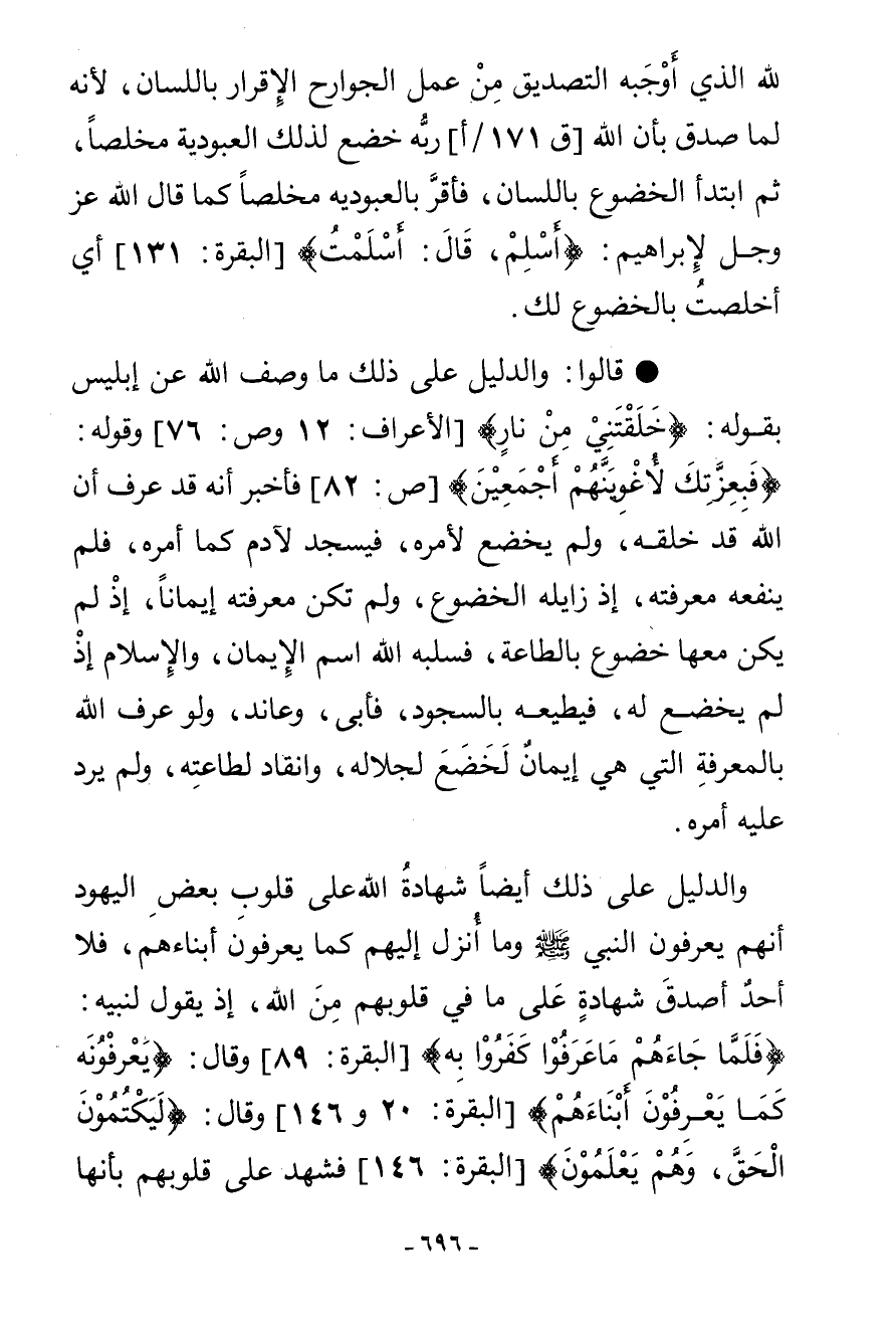 لِلَّهِ الَّذِي أَوْجَبَهُ التَّصْدِيقُ مِنْ عَمَلِ الْجَوَارِحِ الْإِقْرَارُ بِاللِّسَانِ لِأَنَّهُ لَمَّا صَدَّقَ بِأَنَّ اللَّهَ رَبَّهُ خَضَعَ لِذَلِكَ الْعُبُودِيَّةِ مُخْلِصًا، ثُمَّ ابْتَدَأَ الْخُضُوعُ بِاللِّسَانِ، فَأَقَرَّ بِالْعُبُودِيَّةِ مُخْلِصًا كَمَا قَالَ اللَّهُ عَزَّ وَجَلَّ لِإِبْرَاهِيمَ: {أَسْلِمْ قَالَ أَسْلَمْتُ} [البقرة: 131] أَيْ أَخْلَصْتُ بِالْخُضُوعِ لَكَ. قَالُوا: وَالدَّلِيلُ عَلَى ذَلِكَ مَا وَصَفَ اللَّهُ عَنْ إِبْلِيسَ بِقَوْلِهِ: {خَلَقْتَنِي مِنْ نَارٍ} [الأعراف: 12] ، وَقَوْلِهِ {فَبِعِزَّتِكَ لَأُغْوِيَنَّهُمْ أَجْمَعِينَ} [ص: 82] فَأَخْبَرَ أَنَّهُ قَدْ عَرَفَ أَنَّ اللَّهَ قَدْ خَلَقَهُ، وَلَمْ يَخْضَعْ لِأَمْرِهِ فَيَسْجُدَ لِآدَمَ كَمَا أَمَرَهُ فَلَمْ يَنْفَعْهُ مَعْرِفَتُهُ إِذْ زَايَلَهُ الْخُضُوعُ، وَلَمْ تَكُنْ مَعْرِفَتُهُ إِيمَانًا إِذْ لَمْ يَكُنْ مَعَهَا خُضُوعٌ بِالطَّاعَةِ فَسَلَبَهُ اللَّهُ اسْمَ الْإِيمَانِ وَالْإِسْلَامِ إِذْ لَمْ يَخْضَعْ لَهُ فَيُطِيعُهُ بِالسُّجُودِ فَأَبَى وَعَانَدَ، وَلَوْ عَرَفَ اللَّهَ بِالْمَعْرِفَةِ الَّتِي هِيَ إِيمَانٌ لَخَضَعَ لِجَلَالِهِ، وَانْقَادَ لِطَاعَتِهِ، وَلَمْ يَرُدَّ عَلَيْهِ أَمْرَهُ، وَالدَّلِيلُ عَلَى ذَلِكَ أَيْضًا شَهَادَةُ اللَّهِ عَلَى قُلُوبِ بَعْضِ الْيَهُودِ أَنَّهُمْ يَعْرِفُونَ النَّبِيَّ صَلَّى اللهُ عَلَيْهِ وَسَلَّمَ وَمَا أُنْزِلَ إِلَيْهِمْ كَمَا يَعْرِفُونَ أَبْنَاءَهُمْ فَلَا أَحَدٌ أَصْدَقُ شَهَادَةً عَلَى مَا فِي قُلُوبِهِمْ مِنَ اللَّهِ إِذْ يَقُولُ لِنَبِيِّهِ: {فَلَمَّا جَاءَهُمْ مَا عَرَفُوا كَفَرُوا بِهِ} [البقرة: 89] وَقَالَ: {يَعْرِفُونَهُ كَمَا يَعْرِفُونَ أَبْنَاءَهُمْ} [البقرة: 146] وَقَالَ: {لَيَكْتُمُونَ الْحَقَّ وَهُمْ يَعْلَمُونَ} [البقرة: 146] فَشَهِدَ عَلَى قُلُوبِهِمْ بِأَنَّهَا