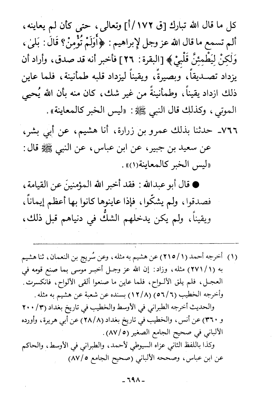 766 - حَدَّثَنَا بِذَلِكَ، عَمْرُو بْنُ زُرَارَةَ، أنا هُشَيْمٌ، عَنْ أَبِي بِشْرٍ، عَنْ سَعِيدِ بْنِ جُبَيْرٍ، عَنِ ابْنِ عَبَّاسٍ، عَنِ النَّبِيِّ صَلَّى اللهُ عَلَيْهِ وَسَلَّمَ قَالَ: «§لَيْسَ الْخَبَرُ كَالْمُعَايَنَةِ.» قَالَ أَبُو عَبْدِ اللَّهِ: فَقَدْ أَخْبَرَ اللَّهُ الْمُؤْمِنِينَ عَنِ الْقِيَامَةِ فَصَدَّقُوا، وَلَمْ يَشُكُّوا فَإِذَا عَايَنُوهَا كَانُوا بِهَا أَعْظَمَ إِيمَانًا وَيَقِينًا، وَلَمْ يَكُنْ يَدْخُلُهُمُ الشَّكُّ فِي دُنْيَاهُمْ قَبْلَ ذَلِكَ -[699]- وَلَكِنْ لَمَّا عَايَنُوا الْأَمْرَ عَظُمَ فِي قُلُوبِهِمْ أَكْثَرَ مِمَّا كَانُوا يُصَدِّقُونَ بِهِ فِي الْجُمْلَةِ حَتَّى ذَهِلَتْ عُقُولُ الرُّسُلِ فَمَنْ دُونَهُمْ، وَأَنَّ ذَلِكَ لَمَوْجُودٌ فِي فِطَرِنَا يَأْتِينَا الصَّادِقُ بِالْخَبَرِ بِأَنَّ حَبِيبَ أَحَدِنَا قَدْ مَاتَ فَنُصَدِّقُهُ وَنَسْتَثِيرُ مِنْهُ الْحُزْنَ ثُمَّ نُتَابِعُ الْأَخْبَارَ عَلَيْهِ، فَكُلُّ مَا أَخْبَرَهُ مُخْبِرٌ ازْدَادَ يَقِينًا وَتَصْدِيقًا مِنْ غَيْرِ شَكٍّ مِنْهُ فِي الْخَبَرِ الْأَوَّلِ فَإِذَا عَايَنَهُ امْتَلَأَ قَلْبُهُ يَقِينًا بِأَنَّهُ قَدْ مَاتَ، ثُمَّ أَثَارَ مِنْ قَلْبِهِ مِنَ الْحُزْنِ مَا لَمْ يَكُنْ مِنْ قَبْلُ حَتَّى كَأَنَّهُ كَانَ شَاكًّا فِي خَبَرِ الْمُخْبِرِينَ، فَكَذَلِكَ يَزْدَادُ الْعَبْدُ بَصِيرَةً وَيَقِينًا وَتَصْدِيقًا مِنْ غَيْرِ أَنْ يَكُونَ دَخَلَ فِي أَصْلِ تَصْدِيقِهِ شَكٌّ، وَعَنْ ذَلِكَ يَكُونُ الْإِجْلَالُ وَالْهَيْبَةُ، وَعَنِ الْإِجْلَالِ وَالْهَيْبَةِ يَزْدَادُ خُضُوعًا بِالطَّاعَةِ، وَمُسَارَعَةً إِلَى رِضَا طَلَبِ رِضَا الْمَوْلَى