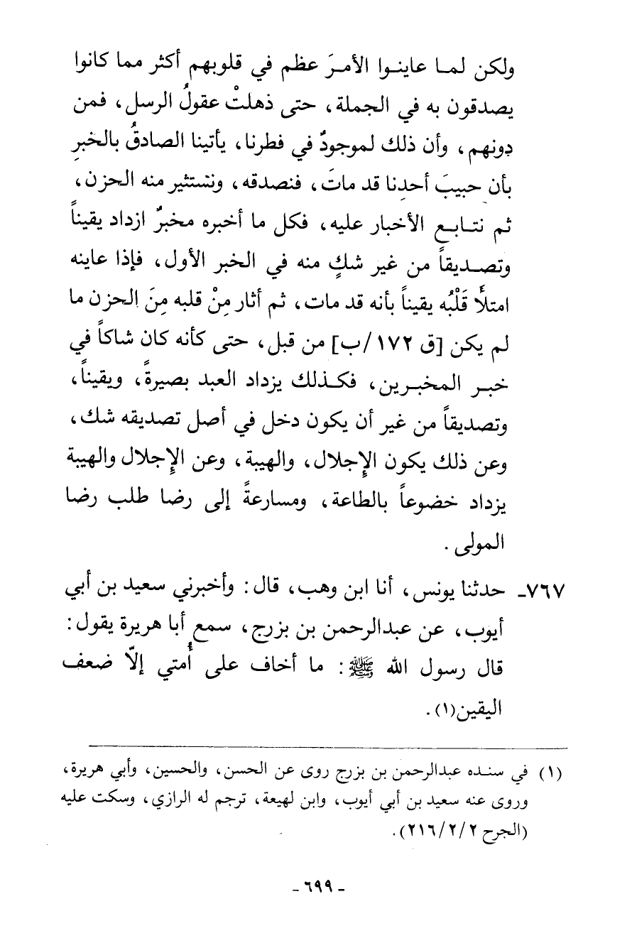 767 - حَدَّثَنَا يُونُسُ، أنا ابْنُ وَهْبٍ، قَالَ: وَأَخْبَرَنِي سَعِيدُ بْنُ أَبِي أَيُّوبَ، عَنْ عَبْدِ الرَّحْمَنِ بْنِ بُزُرْجٍ، سَمِعَ أَبَا هُرَيْرَةَ، يَقُولُ: قَالَ رَسُولُ اللَّهِ صَلَّى اللهُ عَلَيْهِ وَسَلَّمَ: «§مَا أَخَافُ عَلَى أُمَّتِي إِلَّا ضَعْفَ الْيَقِينِ»