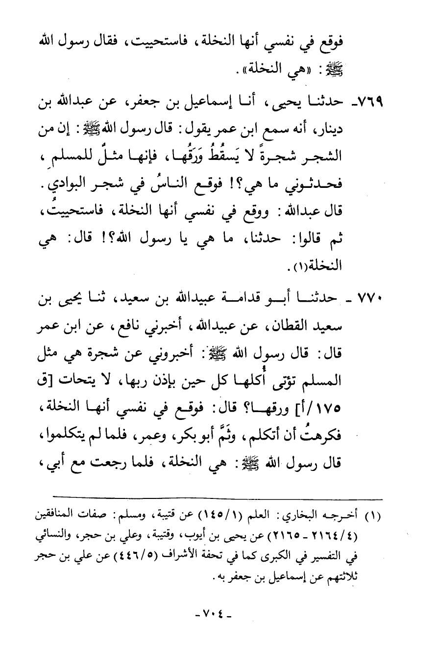 769 - حَدَّثَنَا يَحْيَى، أنا إِسْمَاعِيلُ بْنُ جَعْفَرٍ، عَنْ عَبْدِ اللَّهِ بْنِ دِينَارٍ، أَنَّهُ سَمِعَ ابْنَ عُمَرَ، يَقُولُ: قَالَ رَسُولُ اللَّهِ صَلَّى اللهُ عَلَيْهِ وَسَلَّمَ: «إِنَّ §مِنَ الشَّجَرِ شَجَرَةً لَا يَسْقُطُ وَرَقُهَا فَإِنَّهَا مَثَلٌ لِلْمُسْلِمِ فَحَدِّثُونِي مَا هِيَ؟» فَوَقَعَ النَّاسُ فِي شَجَرِ الْبَوَادِي قَالَ عَبْدُ اللَّهِ: وَوَقَعَ فِي نَفْسِي أَنَّهَا النَّخْلَةُ فَاسْتَحْيَيْتُ، ثُمَّ قَالُوا: حَدِّثْنَا مَا هِيَ يَا رَسُولَ اللَّهِ؟ قَالَ: «هِيَ النَّخْلَةُ»