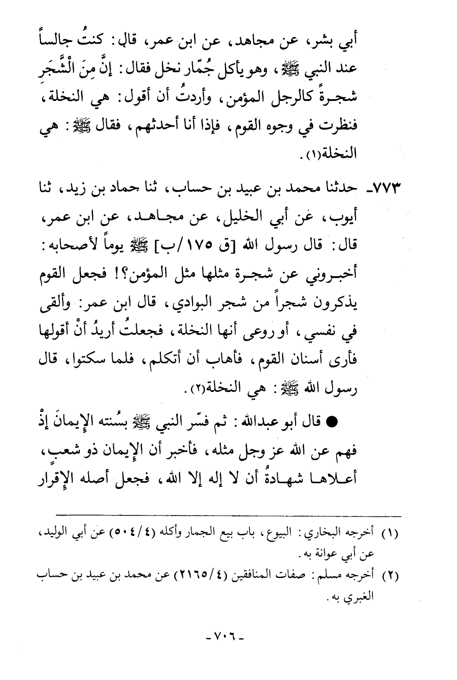 773 - حَدَّثَنَا مُحَمَّدُ بْنُ عُبَيْدِ بْنِ حِسَابٍ، ثنا حَمَّادُ بْنُ زَيْدٍ، ثنا أَيُّوبُ، عَنْ أَبِي الْخَلِيلِ، عَنْ مُجَاهِدٍ، عَنِ ابْنِ عُمَرَ، قَالَ: قَالَ رَسُولُ اللَّهِ صَلَّى اللهُ عَلَيْهِ وَسَلَّمَ يَوْمًا لِأَصْحَابِهِ: «§أَخْبِرُونِي عَنْ شَجَرَةٍ مَثَلُهَا مَثَلُ الْمُؤْمِنِ» فَجَعَلَ الْقَوْمُ يَذْكُرُونَ شَجَرًا مِنْ شَجَرِ الْبَوَادِي، قَالَ ابْنُ عُمَرَ: وَأُلْقِيَ فِي نَفْسِي أَوْ رُوعِي أَنَّهَا النَّخْلَةُ فَجَعَلْتُ أُرِيدُ أَنْ أَقُولَهَا فَأَرَى أَسْنَانَ الْقَوْمِ فَأَهَابُ أَنْ أَتَكَلَّمَ فَلَمَّا سَكَتُوا قَالَ رَسُولُ اللَّهِ صَلَّى اللهُ عَلَيْهِ وَسَلَّمَ: «هِيَ النَّخْلَةُ» قَالَ أَبُو عَبْدِ اللَّهِ: ثُمَّ فَسَّرَ النَّبِيُّ صَلَّى اللهُ عَلَيْهِ وَسَلَّمَ بِسُنَّتِهِ الْإِيمَانَ إِذْ فُهِمَ عَنِ اللَّهِ عَزَّ وَجَلَّ مِثْلَهُ فَأَخْبَرَ أَنَّ الْإِيمَانَ ذُو شُعَبٍ أَعْلَاهَا شَهَادَةُ أَنْ لَا إِلَهَ إِلَّا اللَّهُ فَجَعَلَ أَصْلَهُ الْإِقْرَارَ -[707]- بِالْقَلْبِ وَاللِّسَانِ، وَجَعَلَ شُعْبَةَ الْإِيمَانِ ثُمَّ جَعَلَ فِي غَيْرِ حَدِيثٍ الْأَعْمَالَ شُعَبًا مِنَ الْإِيمَانِ فَاسْتَعْجَمَ عَلَى الْمُرْجِئِ الْفَهْمُ فَضَرَبَ الْمَثَلَ بِخِلَافِ مَا ضَرَبَهُ اللَّهُ وَالرَّسُولُ، وَقَالَ: «مِثْلَ عَشْرَةِ دَرَاهِمَ» لِيُبْطِلَ سُنَّةَ الرَّسُولِ صَلَّى اللهُ عَلَيْهِ وَسَلَّمَ وَيَجْعَلُ قَوْلَهُ هُوَ الْحَقُّ بِخِلَافِ الْآثَارِ، لِأَنَّ الَّذِي سَمَّى الْإِيمَانَ التَّصْدِيقَ هُوَ الَّذِي أَخْبَرَ أَنَّ الْإِيمَانَ ذُو شُعَبٍ فَمَنْ لَمْ يُسَمِّ الْأَعْمَالَ شُعَبًا كَمَا جَعَلَهُ الرَّسُولُ صَلَّى اللهُ عَلَيْهِ وَسَلَّمَ وَكَمَا ضَرَبَ اللَّهُ الْمَثَلَ بِهِ فَقَدْ خَالَفَ سُنَّةَ الرَّسُولِ صَلَّى اللهُ عَلَيْهِ وَسَلَّمَ وَلَيْسَ لَهُ أَنْ يُفَرِّقَ بَيْنَ صِفَاتِ النَّبِيِّ صَلَّى اللهُ عَلَيْهِ وَسَلَّمَ لِلْإِيمَانِ فَيُؤْمِنُ بِبَعْضِهَا، وَيَكْفُرُ بِبَعْضِهَا لِأَنَّهُ صَلَّى اللهُ عَلَيْهِ وَسَلَّمَ حِينَ سَأَلَهُ جِبْرِيلُ: مَا الْإِيمَانُ؟ قَالَ: «أَنْ تُؤْمِنَ بِاللَّهِ» إِلَى آخِرِ الْقَوْلِ، ثُمَّ قَالَ فِي حَدِيثِ ابْنِ عَبَّاسٍ لِوَفْدِ عَبْدِ الْقَيْسِ: «آمُرُكُمْ بِالْإِيمَانِ» ثُمَّ قَالَ: «أَتَدْرُونَ مَا الْإِيمَانُ بِاللَّهِ؟ شَهَادَةُ أَنْ لَا إِلَهَ إِلَّا اللَّهُ» فَبَدَأَ بِأَصْلِهِ، وَالشَّاهِدُ بِلَا إِلَهَ إِلَّا اللَّهُ هُوَ الْمُصَدِّقُ الْمُقِرُّ بِقَلْبِهِ يَشْهَدُ بِهَا لِلَّهِ بِقَلْبِهِ وَلِسَانِهِ، يَبْتَدِئُ بِشَهَادَةِ قَلْبِهِ وَالْإِقْرَارِ بِهِ، ثُمَّ يُثَنِّي بِالشَّهَادَةِ بِلِسَانِهِ، وَالْإِقْرَارِ بِهِ كَمَا قَالَ مَنْ قَالَ: لَا إِلَهَ إِلَّا اللَّهُ يَرْجِعُ بِهَا إِلَى الْقَلْبِ مُخْلِصًا يَعْنِي مُخْلِصًا بِالشَّهَادَةِ قَلْبُهُ لَيْسَ كَمَا شَهِدَتِ الْمُنَافِقُونَ إِذْ: {قَالُوا نَشْهَدُ إِنَّكَ لَرَسُولُ اللَّهِ} [المنافقون: 1] قَالَ اللَّهُ: {وَاللَّهُ -[708]- يَشْهَدُ إِنَّ الْمُنَافِقِينَ لَكَاذِبُونَ} [المنافقون: 1] ، فَلَمْ يُكَذِّبْ قُلُوبَهُمْ أَنَّهُ حَقٌّ فِي عَيْنِهِ، وَلَكِنْ كَذَّبَهُمْ مِنْ قَوْلِهِمْ، فَقَالَ: {وَاللَّهُ يَعْلَمُ إِنَّكَ لَرَسُولُهُ} [المنافقون: 1] أَيْ كَمَا قَالُوا، ثُمَّ قَالَ: {وَاللَّهُ يَشْهَدُ إِنَّ الْمُنَافِقِينَ لَكَاذِبُونَ} [المنافقون: 1] فَكَذَّبَهُمْ مِنْ قَوْلِهِمْ لَا أَنَّهُمْ قَالُوا بِأَلْسِنَتِهِمْ بَاطِلًا وَلَا كَذِبًا، وَكَذَلِكَ حِينَ أَجَابَ النَّبِيُّ صَلَّى اللهُ عَلَيْهِ وَسَلَّمَ جِبْرِيلَ بِقَوْلِهِ: «الْإِسْلَامُ شَهَادَةُ أَنْ لَا إِلَهَ إِلَّا اللَّهُ» لَمْ يُرِدْ شَهَادَةً بِاللِّسَانِ كَشَهَادَةِ 