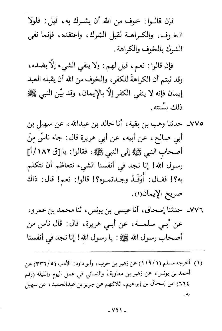 775 - حَدَّثَنَا وَهْبُ بْنُ بَقِيَّةَ، أنا خَالِدُ بْنُ عَبْدِ اللَّهِ، عَنْ سُهَيْلِ بْنِ أَبِي صَالِحٍ، عَنْ أَبِيهِ، عَنْ أَبِي هُرَيْرَةَ، قَالَ: §جَاءَ نَاسٌ مِنْ أَصْحَابِ النَّبِيِّ صَلَّى اللهُ عَلَيْهِ وَسَلَّمَ إِلَى النَّبِيِّ صَلَّى اللهُ عَلَيْهِ وَسَلَّمَ فَقَالُوا: يَا رَسُولَ اللَّهِ إِنَّا نَجِدُ فِي أَنْفُسِنَا الشَّيْءَ نَتَعَاظَمُ أَنْ نَتَكَلَّمَ بِهِ؟ فَقَالَ: «أَوَقَدْ وَجَدْتُمُوهُ؟» قَالُوا: نَعَمْ، قَالَ: «ذَاكَ صَرِيحُ الْإِيمَانِ»