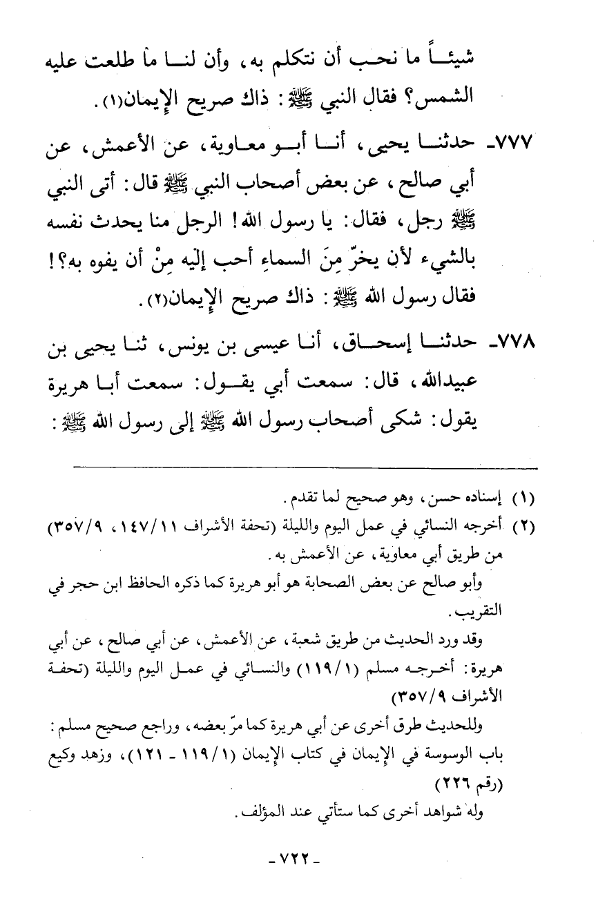 777 - حَدَّثَنَا يَحْيَى، أنا أَبُو مُعَاوِيَةَ، عَنِ الْأَعْمَشِ، عَنْ أَبِي صَالِحٍ، عَنْ بَعْضِ، أَصْحَابِ النَّبِيِّ صَلَّى اللهُ عَلَيْهِ وَسَلَّمَ قَالَ: أَتَى النَّبِيَّ صَلَّى اللهُ عَلَيْهِ وَسَلَّمَ رَجُلٌ فَقَالَ يَا رَسُولَ اللَّهِ: §الرَّجُلُ مِنَّا يُحَدِّثُ نَفْسَهُ بِالشَّيْءِ لَأَنْ يَخِرَّ مِنَ السَّمَاءِ أَحَبُّ إِلَيْهِ مِنْ أَنْ يَفُوهَ بِهِ فَقَالَ رَسُولُ اللَّهِ صَلَّى اللهُ عَلَيْهِ وَسَلَّمَ: «ذَاكَ صَرِيحُ الْإِيمَانِ»