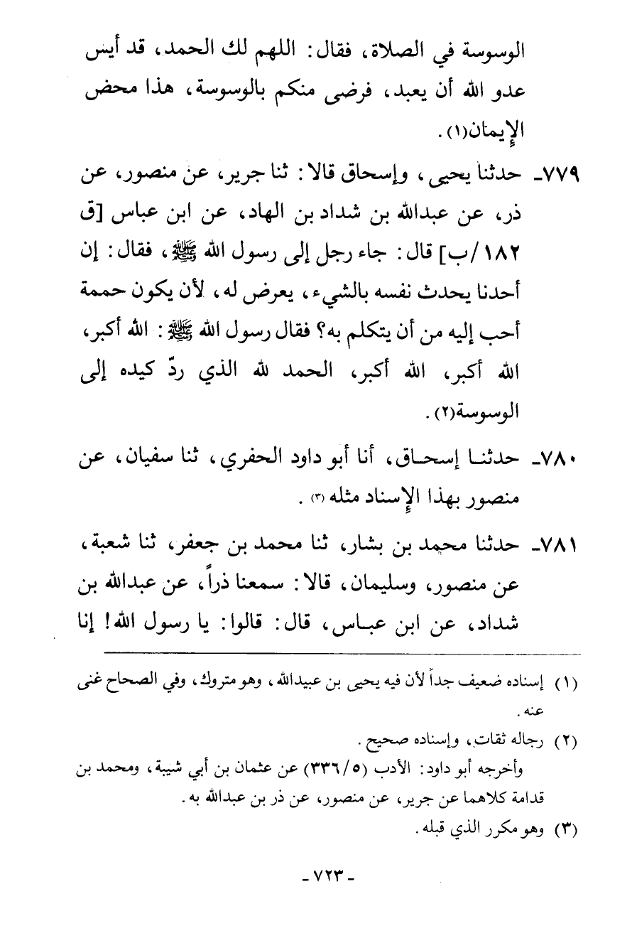 779 - حَدَّثَنَا يَحْيَى، وَإِسْحَاقُ، قَالَا: ثنا جَرِيرٌ، عَنْ مَنْصُورٍ، عَنْ ذَرٍّ، عَنْ عَبْدِ اللَّهِ بْنِ شَدَّادِ بْنِ الْهَادِ، عَنِ ابْنِ عَبَّاسٍ، قَالَ: جَاءَ رَجُلٌ إِلَى رَسُولِ اللَّهِ صَلَّى اللهُ عَلَيْهِ وَسَلَّمَ فَقَالَ: إِنَّ §أَحَدَنَا يُحَدِّثُ نَفْسَهُ بِالشَّيْءِ يَعْرِضُ لَهُ لَأَنْ يَكُونَ حُمَمَةً أَحَبُّ إِلَيْهِ مِنْ أَنْ يَتَكَلَّمَ بِهِ، فَقَالَ رَسُولُ اللَّهِ صَلَّى اللهُ عَلَيْهِ وَسَلَّمَ: «اللَّهُ أَكْبَرُ، اللَّهُ أَكْبَرُ، اللَّهُ أَكْبَرُ، الْحَمْدُ لِلَّهِ الَّذِي رَدَّ كَيْدَهُ إِلَى الْوَسْوَسَةِ»