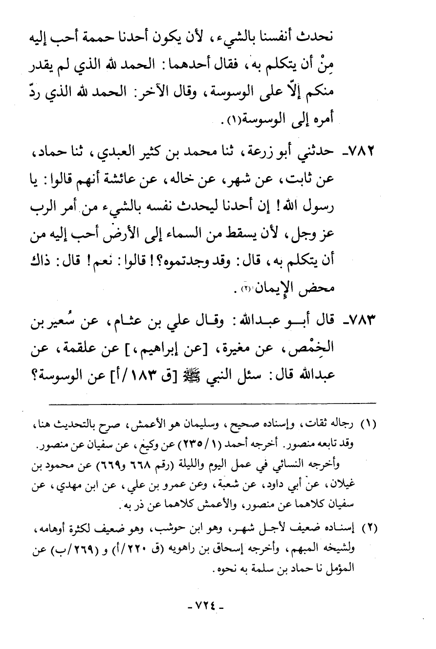 782 - حَدَّثَنِي أَبُو زُرْعَةَ، ثنا مُحَمَّدُ بْنُ كَثِيرٍ الْعَبْدِيُّ، ثنا حَمَّادٌ، عَنْ ثَابِتٍ، عَنْ شَهْرٍ، عَنْ خَالِهِ، عَنْ عَائِشَةَ، §أَنَّهُمْ قَالُوا: يَا رَسُولَ اللَّهِ إِنَّ أَحَدَنَا لَيُحَدِّثُ نَفْسَهُ بِالشَّيْءِ مِنْ أَمْرِ الرَّبِّ عَزَّ وَجَلَّ لَأَنْ يَسْقُطَ مِنَ السَّمَاءِ إِلَى الْأَرْضِ أَحَبُّ إِلَيْهِ مِنْ أَنْ يَتَكَلَّمَ بِهِ قَالَ: «وَقَدْ وَجَدْتُمُوهُ؟» قَالُوا: نَعَمْ، قَالَ: «ذَاكَ مَحْضُ الْإِيمَانِ»