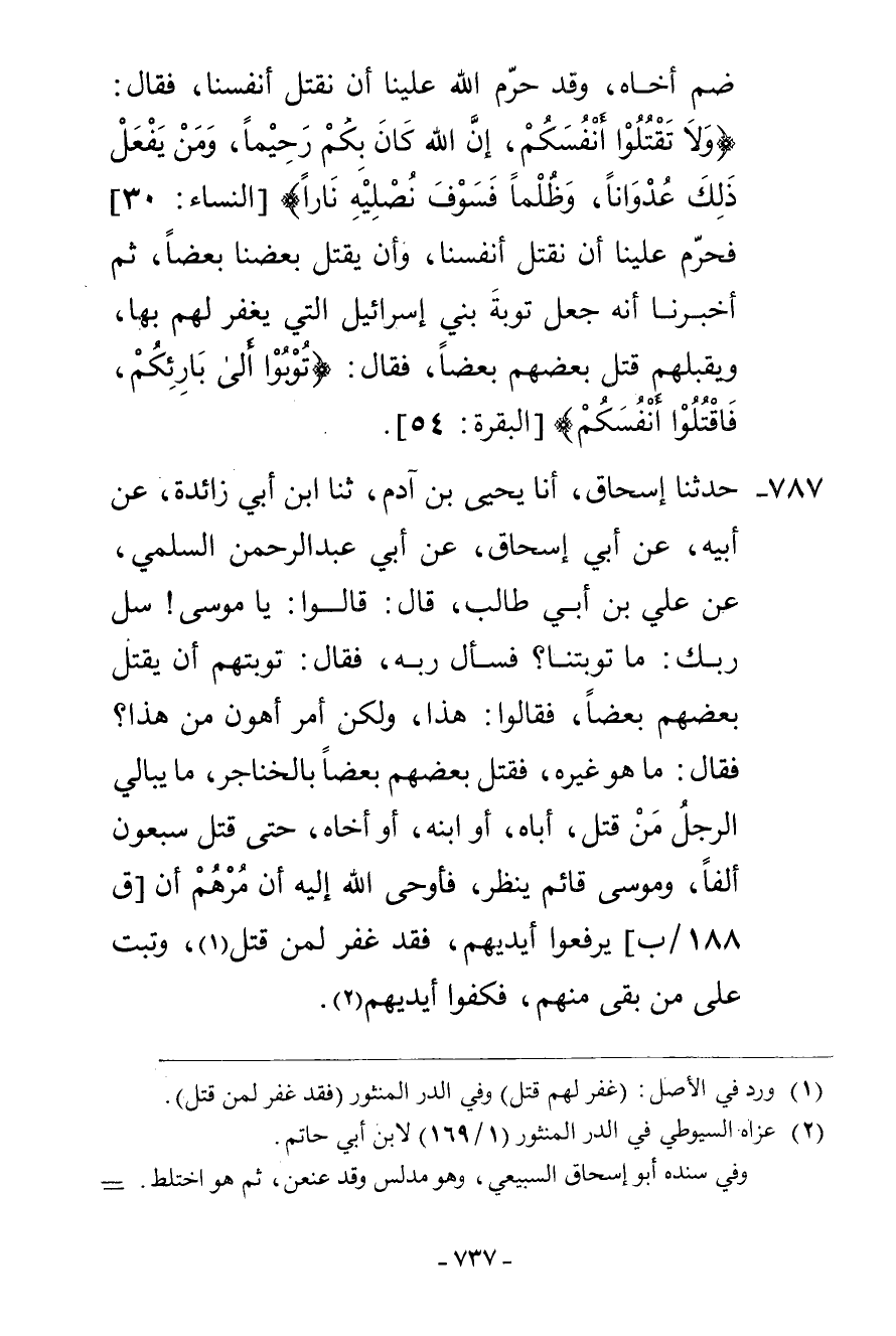 787 - حَدَّثَنَا إِسْحَاقُ، أنا يَحْيَى بْنُ آدَمَ، ثنا ابْنُ أَبِي زَائِدَةَ، عَنْ أَبِيهِ، عَنْ أَبِي إِسْحَاقَ، عَنْ أَبِي عَبْدِ الرَّحْمَنِ السُّلَمِيِّ، عَنْ عَلِيِّ بْنِ أَبِي طَالِبٍ، قَالَ: " §قَالُوا: يَا مُوسَى سَلْ رَبَّكَ: مَا تَوْبَتُنَا؟ فَسَأَلَ رَبَّهُ، فَقَالَ: تَوْبَتُهُمْ أَنْ يَقْتُلَ بَعْضُهُمْ بَعْضًا، فَقَالُوا: هَذَا وَلَكِنْ أَمْرٌ أَهْوَنُ مِنْ هَذَا؟ فَقَالَ: مَا هُوَ غَيْرُهُ، فَقَتَلَ بَعْضُهُمْ بَعْضًا بِالْخَنَاجِرِ، مَا يُبَالِي الرَّجُلُ مَنْ قَتَلَ أَبَاهُ أَوِ ابْنَهُ أَوْ أَخَاهُ حَتَّى قُتِلَ سَبْعُونَ أَلْفًا، وَمُوسَى قَائِمٌ يَنْظُرُ فَأَوْحَى اللَّهُ إِلَيْهِ أَنْ مُرْهُمْ أَنْ يَرْفَعُوا أَيْدِيَهُمْ فَقَدْ غُفِرَ لِمَنْ قُتِلَ، وَتُبْتُ عَلَى مَنْ بَقِيَ مِنْهُمْ فَكَفُّوا أَيْدِيَهُمْ "