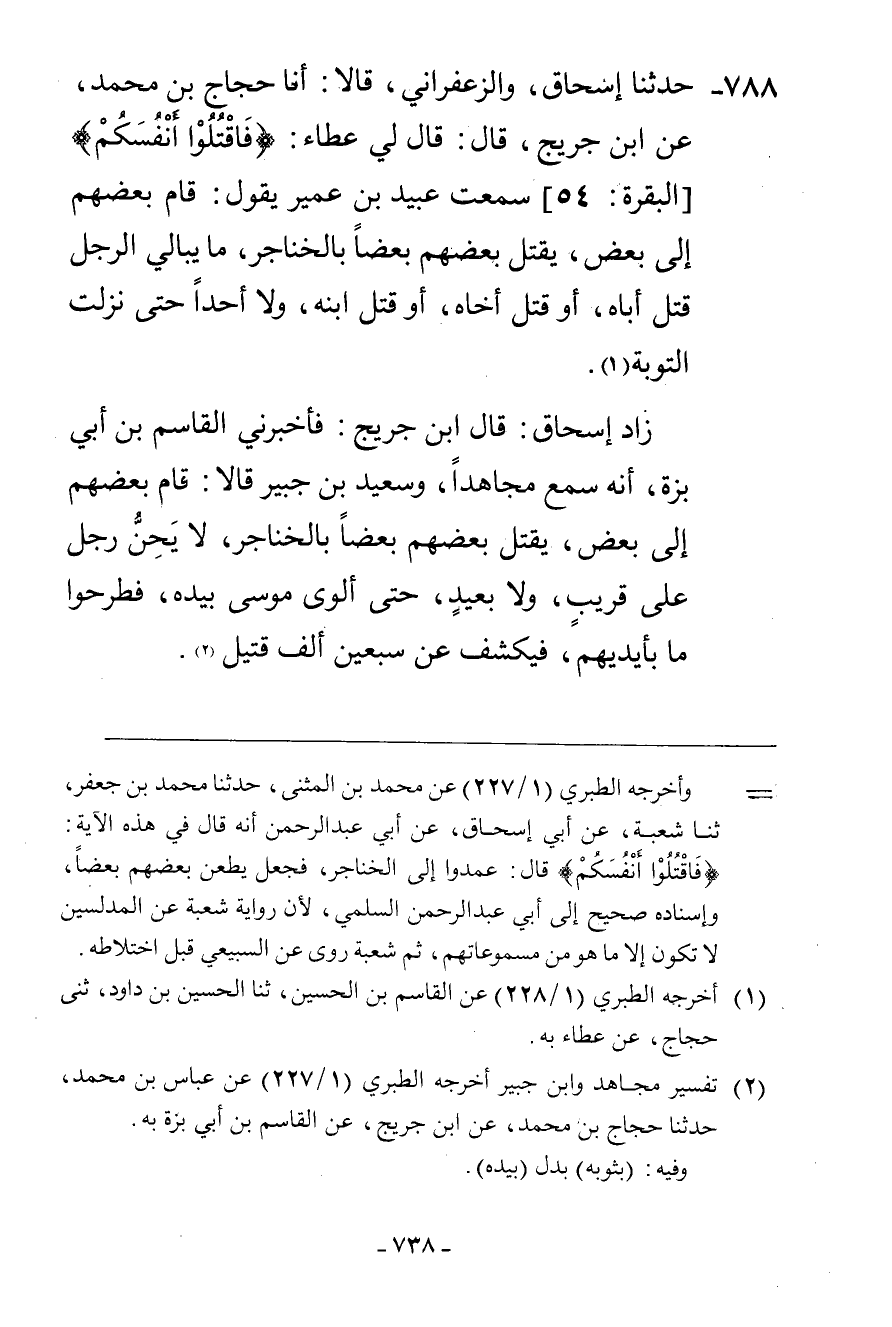 788 - حَدَّثَنَا إِسْحَاقُ، وَالزَّعْفَرَانِيُّ، قَالَا: أنا حَجَّاجُ بْنُ مُحَمَّدٍ، عَنِ ابْنِ جُرَيْجٍ، قَالَ: قَالَ لِي عَطَاءٌ: " {فَاقْتُلُوا أَنْفُسَكُمْ} [البقرة: 54] سَمِعْتُ عُبَيْدَ بْنَ عُمَيْرٍ يَقُولُ: §قَامَ بَعْضُهُمْ إِلَى بَعْضٍ يَقْتُلُ بَعْضُهُمْ بَعْضًا بِالْخَنَاجِرِ مَا يُبَالِي الرَّجُلُ قَتَلَ أَبَاهُ أَوْ قَتَلَ أَخَاهُ أَوْ قَتَلَ ابْنَهُ وَلَا أَحَدًا حَتَّى نَزَلَتِ التَّوْبَةُ " زَادَ إِسْحَاقُ: قَالَ ابْنُ جُرَيْجٍ: فَأَخْبَرَنِي الْقَاسِمُ بْنُ أَبِي بَزَّةَ أَنَّهُ سَمِعَ مُجَاهِدًا وَسَعِيدَ بْنَ جُبَيْرٍ قَالَا: «قَامَ بَعْضُهُمْ إِلَى بَعْضٍ يَقْتُلُ بَعْضُهُمْ بَعْضًا بِالْخَنَاجِرِ لَا يَحِنُّ رَجُلٌ عَلَى قَرِيبٍ وَلَا بَعِيدٍ حَتَّى أَلْوَى مُوسَى بِيَدِهِ فَطَرَحُوا مَا بِأَيْدِيهِمْ فَيُكْشَفُ عَنْ سَبْعِينَ أَلْفِ قَتِيلٍ»