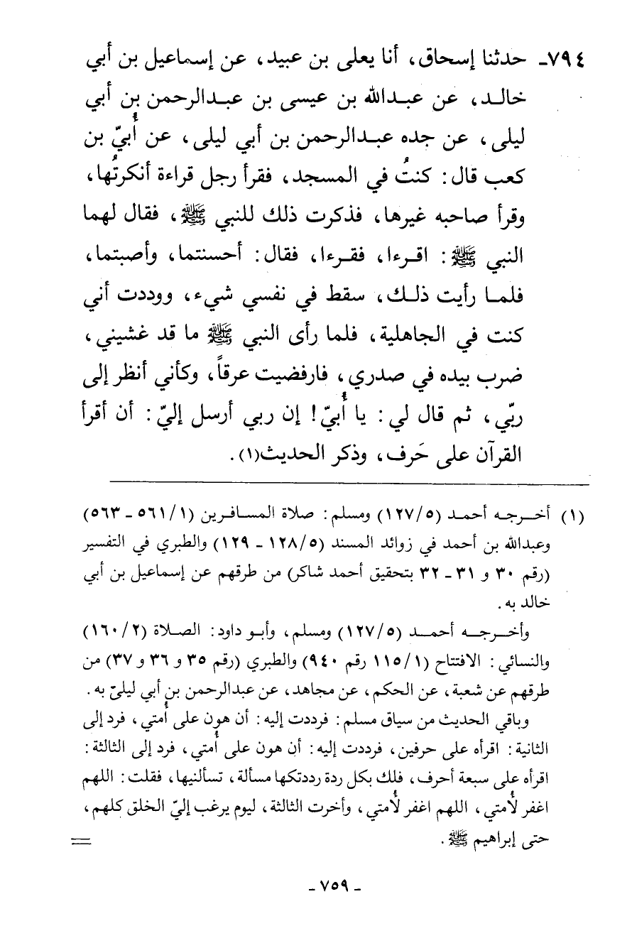 794 - حَدَّثَنَا إِسْحَاقُ، أنا يَعْلَى بْنُ عُبَيْدٍ، عَنْ إِسْمَاعِيلَ بْنِ أَبِي خَالِدٍ، عَنْ عَبْدِ اللَّهِ بْنِ عِيسَى بْنِ عَبْدِ الرَّحْمَنِ بْنِ أَبِي لَيْلَى، عَنْ جَدِّهِ عَبْدِ الرَّحْمَنِ بْنِ أَبِي لَيْلَى، عَنْ أُبَيِّ بْنِ كَعْبٍ، قَالَ: " §كُنْتُ فِي الْمَسْجِدِ فَقَرَأَ رَجُلٌ قِرَاءَةً أَنْكَرْتُهَا وَقَرَأَ صَاحِبُهُ غَيْرَهَا، فَذَكَرْتُ ذَلِكَ لِلنَّبِيِّ صَلَّى اللهُ عَلَيْهِ وَسَلَّمَ فَقَالَ لَهُمَا النَّبِيُّ صَلَّى اللهُ عَلَيْهِ وَسَلَّمَ: «اقْرَأَا» فَقَرَأَا، فَقَالَ: أَحْسَنْتُمَا وَأَصَبْتُمَا، فَلَمَّا رَأَيْتُ ذَلِكَ سَقَطَ فِي نَفْسِي شَيْءٌ وَوَدِدْتُ أَنِّي كُنْتُ فِي الْجَاهِلِيَّةِ فَلَمَّا رَأَى النَّبِيُّ صَلَّى اللهُ عَلَيْهِ وَسَلَّمَ مَا قَدْ غَشِيَنِي ضَرَبَ بِيَدِهِ فِي صَدْرِي فَارْفَضَّيْتُ عَرَقًا وَكَأَنِّي أَنْظُرُ إِلَى رَبِّي، ثُمَّ قَالَ لِي: «يَا أُبَيُّ إِنَّ رَبِّي أَرْسَلَ إِلَيَّ أَنْ أَقْرَأَ الْقُرْآنَ عَلَى حَرْفٍ» وَذَكَرَ الْحَدِيثَ ".