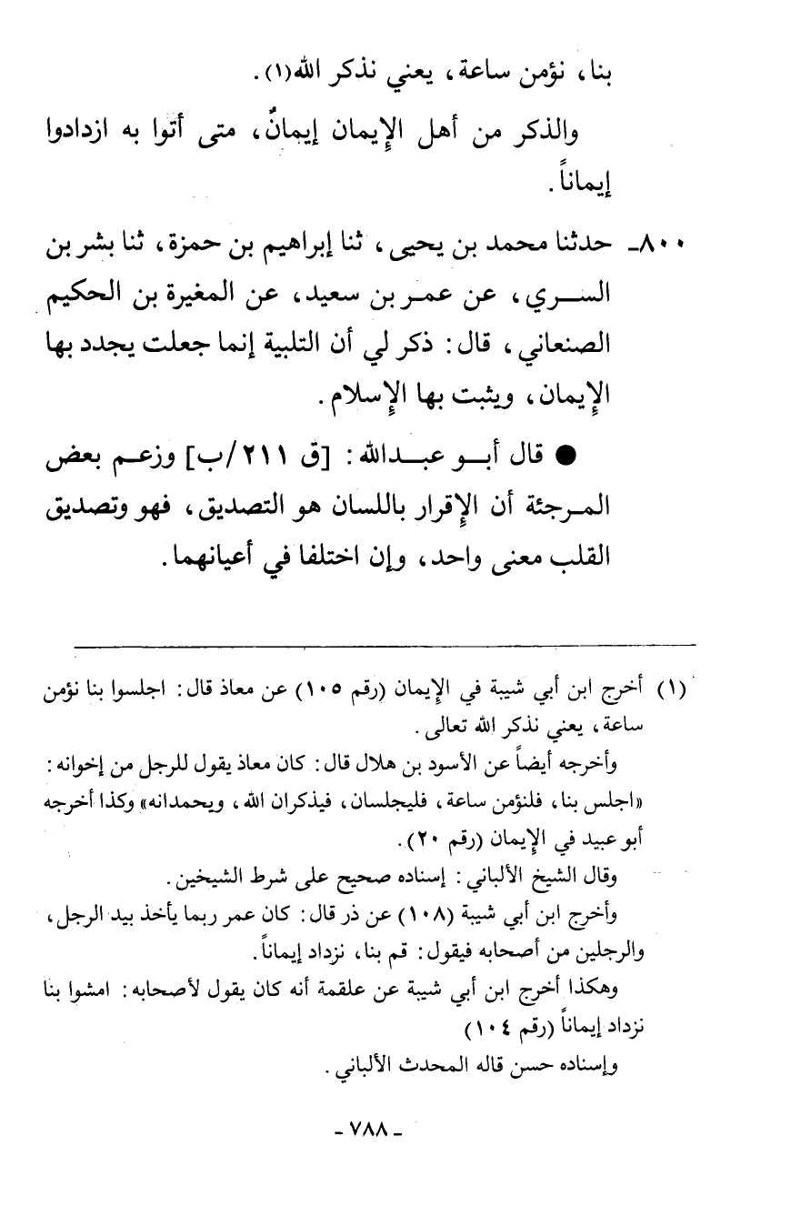 800 - حَدَّثَنَا مُحَمَّدُ بْنُ يَحْيَى، ثنا إِبْرَاهِيمُ بْنُ حَمْزَةَ، ثنا بِشْرُ بْنُ السَّرِيِّ، عَنْ عُمَرَ بْنِ سَعِيدٍ، عَنِ الْمُغِيرَةِ بْنِ الْحَكِيمِ الصَّنْعَانِيِّ، قَالَ: «§ذُكِرَ لِي أَنَّ التَّلْبِيَةَ إِنَّمَا جُعِلَتْ يُجَدَّدُ بِهَا الْإِيمَانُ، وَيَثْبُتُ بِهَا الْإِسْلَامُ» . قَالَ أَبُو عَبْدِ اللَّهِ: وَزَعَمَ بَعْضُ الْمُرْجِئَةِ أَنَّ الْإِقْرَارَ بِاللِّسَانِ هُوَ التَّصْدِيقُ فَهُوَ وَتَصْدِيقُ الْقَلْبِ مَعْنًى وَاحِدٌ، وَإِنِ اخْتَلَفَا فِي أَعْيَانِهِمَا -[789]-. يُقَالُ لَهُمْ: كَيْفَ يَخْتَلِفُ شَيْئَانِ فِي أَعْيَانِهِمَا وَيَتَّفِقَانِ فِي الِاسْمِ مِنْ جِهَةِ مَا اخْتَلَفَا؟ فَإِنْ قَالُوا: ذَلِكَ مَوْجُودٌ فِي اللُّغَةِ، كَمَا يَقُولُ الْقَائِلُ: دِينِي وَدِينُ مُحَمَّدٍ صَلَّى اللهُ عَلَيْهِ وَسَلَّمَ وَاحِدٌ، وَفِعْلُ مُحَمَّدٍ غَيْرُ فِعْلِهِ لِأَنَّ ضَمِيرَهُ غَيْرَ ضَمِيرِهِ، وَقَوْلَهُ غَيْرَ قَوْلِهِ. فَيُقَالُ لَهُمْ: إِنَّمَا يَقُولُ الْقَائِلُ ذَلِكَ يُرِيدُ أَنَّ الدِّينَ الَّذِي شَرَعَهُ اللَّهُ لِمُحَمَّدٍ صَلَّى اللهُ عَلَيْهِ وَسَلَّمَ هُوَ دِينِي، وَلَا يُرِيدُ أَنَّ ضَمِيرَ مُحَمَّدٍ هُوَ ضَمِيرِي لِأَنَّ اسْمَ الْإِيمَانِ فِي مَجَازِ اللُّغَةِ يَقَعُ عَلَى وَجْهَيْنِ: أَحَدُهُمَا عَلَى الْأَمْرِ بِهِ وَالدَّلَالَةِ عَلَيْهِ فِي الظَّاهِرِ، وَالْآخَرُ حَقِيقَةٌ فِي الْمَعْنَى، فَأَمَّا الظَّاهِرُ فِي اللِّسَانِ الَّذِي هُوَ عَلَى الْمَجَازِ، فَقَوْلُ الْمُسْلِمِينَ: جَاءَنَا مُحَمَّدٌ بِالْإِيمَانِ، وَشَرَحَ لَنَا الْإِيمَانَ، وَجَاءَنَا بِالدِّينِ فَإِنَّمَا يَعْنُونَ بَيَانَ الْإِيمَانِ وَتَفْسِيرَهِ كَيْفَ هُوَ، لِأَنَّ اللَّهَ عَزَّ وَجَلَّ أَمَرَ بِالْإِيمَانِ، ثُمَّ فَسَّرَ لَنَا مَا الْإِيمَانُ فَسُمِّيَ تَفْسِيرُ الْإِيمَانِ إِيمَانًا، فَأَمَّا عَلَى الْحَقِيقَةِ فِي الْمَعْنَى فَإِنَّمَا الْإِيمَانُ فِعْلٌ مِنَ الْمُؤْمِنِ، وَلَا جَائِزَ أَنْ يَكُونَ كَلَامُ اللَّهِ فِعْلًا لِلْمُؤْمِنِينَ، وَسَمَّى اللَّهُ الدَّلَالَةَ عَلَى الْإِيمَانِ وَالْأَمْرِ بِهِ إِيمَانًا، وَالْإِيمَانُ فِي عَيْنِهِ فِعْلُ الْمُؤْمِنِ كَمَا يَقُولُ: جَاءَنَا مُحَمَّدٌ صَلَّى اللهُ عَلَيْهِ وَسَلَّمَ بِالصَّلَاةِ، وَإِنَّمَا يُرِيدُ أَمَرَنَا بِالصَّلَاةِ وَاسْتَخْرَجَهَا لَنَا، وَالصَّلَاةُ فِي عَيْنِهَا لَيْسَتْ بِالْأَمْرِ -[790]- وَبِالشَّرْحِ، وَلَكِنَّهَا الْمَأْمُورُ بِهَا الْمَشْرُوحَةُ لِلْعِبَادِ لِأَنَّهَا فِي عَيْنِهَا افْتِتَاحٌ بِتَكْبِيرٍ، وَقِرَاءَةٌ، وَرُكُوعٌ، وَسُجُودٌ، وَذَلِكَ غَيْرُ الْأَمْرِ. فَقَوْلُ الْقَائِلِ: دِينِي وَدِينُ مُحَمَّدٍ صَلَّى اللهُ عَلَيْهِ وَسَلَّمَ وَاحِدٌ يرِيدُ أَنِّي أَدِينُ بِالدِّينِ الَّذِي أَمَرَ اللَّهُ بِهِ مُحَمَّدًا صَلَّى اللهُ عَلَيْهِ وَسَلَّمَ واحداً إِنَّمَا يَعْنِي أَنَّا قَدْ صَلَّيْنَا الصَّلَاةَ الَّتِي أَمَرَ بِهَا جَمِيعًا إِلَّا أَنَّ حَرَكَاتَهُ وَسُكُونَهُ فِي الصَّلَاةِ هِيَ حَرَكَاتِي وَسُكُونِي وَلَوْ كَانَ ذَلِكَ مَعْنًى وَاحِدًا لَكَانَ دِينِي وَدِينُ مُحَمَّدٍ صَلَّى اللهُ عَلَيْهِ وَسَلَّمَ عَلَى مَعْنَى أَنَّ فِعْلَهُ فِعْلِي بِمَعْنًى وَاحِدٍ، لَكَانَ لِي مِنَ الْأَجْرِ مِثْلَ مَا لَهُ فَسَاوَيْتُهُ فِي الْأَجْرِ مِنَ اللَّهِ، وَلَا يَقُولُ هَذَا مُسْلِمٌ فَكَذَلِكَ لَمْ يَعْنِ أَنَّ التَّصْدِيقَ هُوَ الْقَوْلُ بِاللِّسَانِ بَلِ الْقَوْلُ فِي عَيْنِهِ حُرُوفٌ مُؤَلَّفَةٌ وَصَوْتٌ وَحَرَكَاتٌ، وَالتَّصْدِيقُ فِي الْقَلْبِ عَقْدُ ضَمِيرٍ لَا صَوْتٌ، وَلَا حُرُوفٌ، وَلَا حَرَكَاتٌ فَمُحَالٌ أَنْ يَكُونَ أَحَدُهُمَا الْآخَرُ لَوْ جَاز
