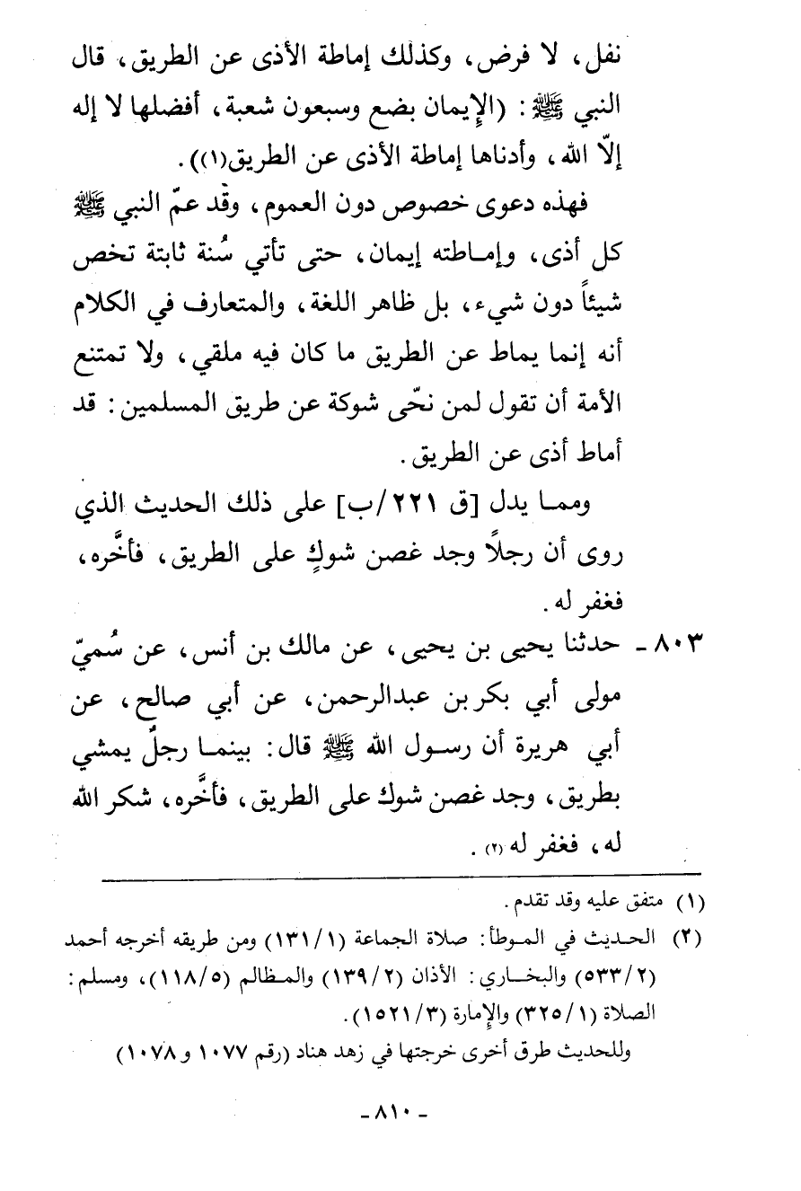 803 - حَدَّثَنَا يَحْيَى بْنُ يَحْيَى، عَنْ مَالِكِ بْنِ أَنَسٍ، عَنْ سُمَيٍّ، مَوْلَى أَبِي بَكْرِ بْنِ عَبْدِ الرَّحْمَنِ، عَنْ أَبِي صَالِحٍ، عَنْ أَبِي هُرَيْرَةَ، أَنَّ رَسُولَ اللَّهِ صَلَّى اللهُ عَلَيْهِ وَسَلَّمَ قَالَ: «§بَيْنَمَا رَجُلٌ يَمْشِي بِطَرِيقٍ وَجَدَ غُصْنَ شَوْكٍ عَلَى الطَّرِيقِ فَأَخَّرَهُ شَكَرَ اللَّهُ لَهُ فَغَفَرَ لَهُ» قَالَ أَبُو عَبْدِ اللَّهِ: فَفِي هَذَا دَلِيلٌ أَنَّ الرَّجُلَ لَمْ يَكُنْ هُوَ الْمُلْقِي لِلْغُصْنِ عَلَى الطَّرِيقِ فَيَكُونُ وَاجِبًا عَلَيْهِ أَنْ يُمِيطَهَا إِنَّمَا كَانَ مُتَطَوِّعًا بِإِمَاطَتِهَا، وَكَذَلِكَ الْأَخْبَارُ الَّتِي جَاءَتْ فِي إِمَاطَةِ الْأَذَى عَنِ الطَّرِيقِ يَدُلُّ عَلَى أَنَّهَا فَضِيلَةٌ وَتَطَوُّعٌ مِنْ ذَلِكَ