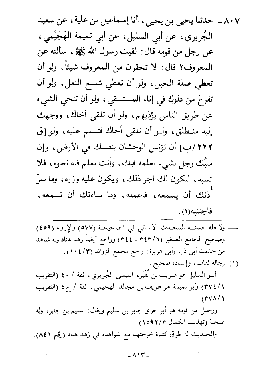 807 - حَدَّثَنَا يَحْيَى بْنُ يَحْيَى، أنا إِسْمَاعِيلُ ابْنُ عُلَيَّةَ، عَنْ سَعِيدٍ الْجُرَيْرِيِّ، عَنْ أَبِي السَّلِيلِ، عَنْ أَبِي تَمِيمَةَ الْهُجَيْمِيِّ، عَنْ رَجُلٍ، مِنْ قَوْمِهِ قَالَ: لَقِيتُ رَسُولَ اللَّهِ صَلَّى اللهُ عَلَيْهِ وَسَلَّمَ §سَأَلْتُهُ عَنِ الْمَعْرُوفِ؟ قَالَ: «لَا تَحْقِرَنَّ مِنَ الْمَعْرُوفِ شَيْئًا وَلَوْ أَنْ تُعْطِيَ صِلَةَ الْحَبْلِ، وَلَوْ أَنْ تُعْطِيَ شِسْعَ النَّعْلِ، وَلَوْ أَنْ تُفْرِغَ مِنْ دَلْوِكَ فِي إِنَاءِ الْمُسْتَسْقِي، وَلَوْ أَنْ تُنَحِّيَ الشَّيْءَ عَنْ طَرِيقِ النَّاسِ يُؤْذِيهِمْ، وَلَوْ أَنْ تَلْقَى أَخَاكَ وَوَجْهُكَ إِلَيْهِ مُنْطَلِقٌ، وَلَوْ أَنْ تَلْقَى أَخَاكَ فَتُسَلِّمَ عَلَيْهِ، وَلَوْ أَنْ تُؤْنِسَ الْوَحْشَانَ بِنَفْسِكَ فِي الْأَرْضِ، وَإِنْ سَبَّكَ رَجُلٌ بِشَيْءٍ يَعْلَمُهُ فِيكَ، وَأَنْتَ تَعْلَمُ فِيهِ نَحْوَهُ فَلَا تَسُبَّهُ لِيَكُونَ لَكَ أَجْرُ ذَلِكَ، وَيَكُونَ عَلَيْهِ وِزْرُهُ، وَمَا سَرَّ أُذُنَكَ أَنْ يَسْمَعَهُ فَاعْمَلْهُ، وَمَا سَاءَتْكَ أَنْ تَسْمَعَهُ فَاجْتَنِبْهُ»