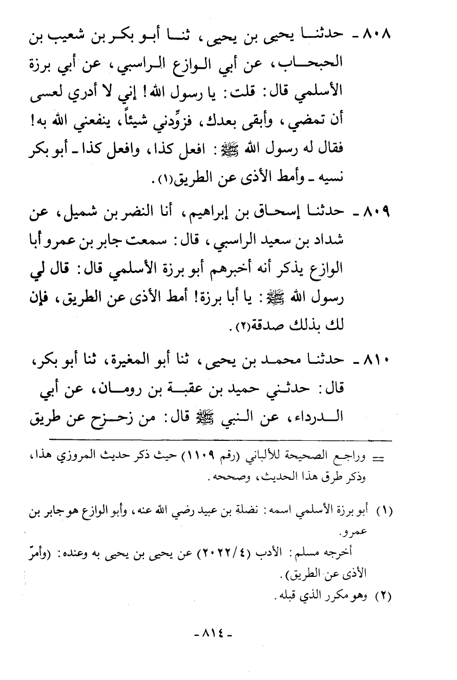 809 - حَدَّثَنَا إِسْحَاقُ بْنُ إِبْرَاهِيمَ، أنا النَّضْرُ بْنُ شُمَيْلٍ، عَنْ شَدَّادِ بْنِ سَعِيدٍ الرَّاسِبِيِّ، قَالَ: سَمِعْتُ جَابِرَ بْنَ عَمْرٍو أَبَا الْوَازِعِ، يَذْكُرُ أَنَّهُ أَخْبَرَهُمْ أَبُو بَرْزَةَ الْأَسْلَمِيُّ، قَالَ: قَالَ لِي رَسُولُ اللَّهِ صَلَّى اللهُ عَلَيْهِ وَسَلَّمَ: «يَا أَبَا بَرْزَةَ §أَمِطِ الْأَذَى عَنِ الطَّرِيقِ فَإِنَّ لَكَ بِذَلِكَ صَدَقَةٌ»