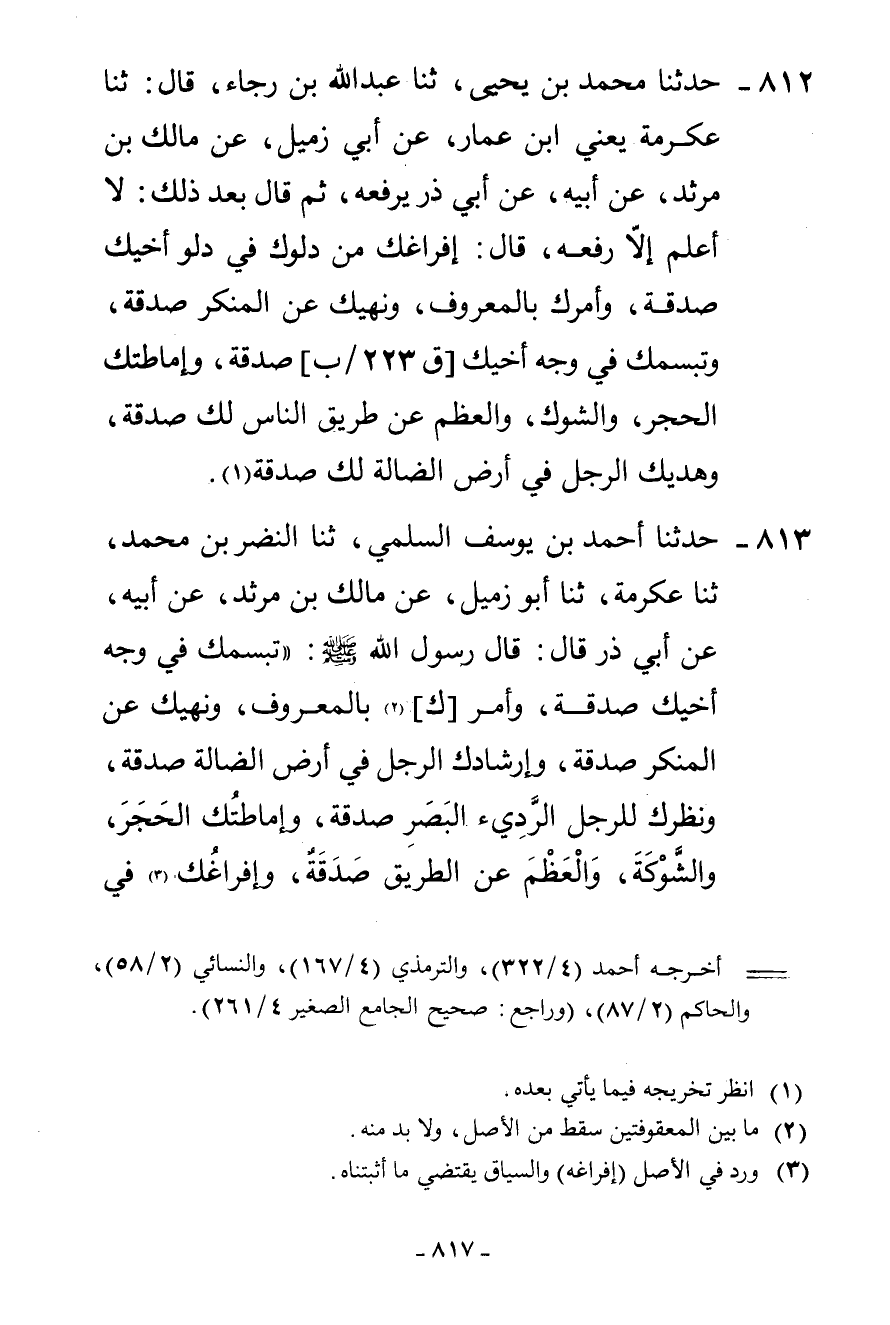 813 - حَدَّثَنَا أَحْمَدُ بْنُ يُوسُفَ السُّلَمِيُّ، ثنا النَّضْرُ بْنُ مُحَمَّدٍ، ثنا عِكْرِمَةُ، ثنا أَبُو زُمَيْلٍ، عَنْ مَالِكِ بْنِ مَرْثَدٍ، عَنْ أَبِيهِ، عَنْ أَبِي ذَرٍّ، قَالَ: قَالَ رَسُولُ اللَّهِ صَلَّى اللهُ عَلَيْهِ وَسَلَّمَ: «§تَبَسُّمُكَ فِي وَجْهِ أَخِيكَ صَدَقَةٌ، وَأَمْرُكَ بِالْمَعْرُوفِ، وَنَهْيُكَ عَنِ الْمُنْكَرِ صَدَقَةٌ، وَإِرْشَادُكَ الرَّجُلَ فِي أَرْضِ الضَّالَّةِ صَدَقَةٌ، وَنَظَرُكَ لِلرَّجُلِ الرَّدِيءِ الْبَصَرِ صَدَقَةٌ، وَإِمَاطَتُكَ الْحَجَرَ وَالشَّوْكَةَ وَالْعَظْمَ عَنِ الطَّرِيقِ صَدَقَةٌ، وَإِفْرَاغُكَ فِي دَلْوِ أَخِيكَ لَكَ صَدَقَةٌ»