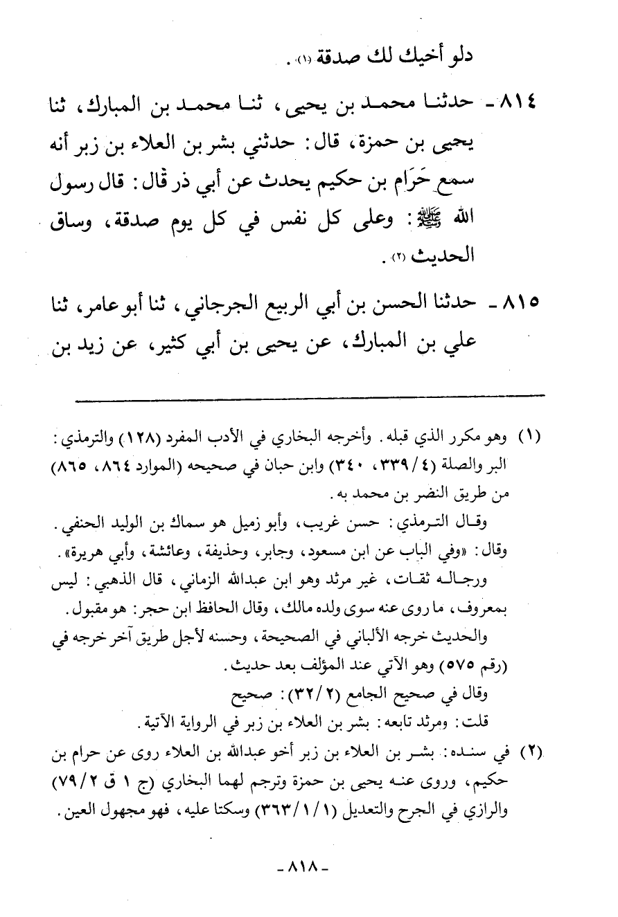 815 - حَدَّثَنَا الْحَسَنُ بْنُ أَبِي الرَّبِيعِ الْجُرْجَانِيُّ، ثنا أَبُو عَامِرٍ، ثنا عَلِيُّ بْنُ الْمُبَارَكِ، عَنْ يَحْيَى بْنِ أَبِي كَثِيرٍ، عَنْ زَيْدِ بْنِ -[819]- سَلَّامٍ، عَنْ أَبِي سَلَّامٍ، أَنَّ أَبَا ذَرٍّ، قَالَ: عَلَى كُلِّ نَفْسٍ كُلَّ يَوْمٍ طَلَعَتْ فِيهِ الشَّمْسُ صَدَقَةٌ مِنْهُ عَلَى نَفْسِهِ، فَقُلْتُ: يَا رَسُولَ اللَّهِ مِنْ أَيْنَ نَتَصَدَّقُ، وَلَيْسَ لَنَا أَمْوَالٌ؟ قَالَ: «§أَوَلَيْسَ مِنْ أَبْوَابِ الصَّدَقَةِ التَّكْبِيرُ وَالْحَمْدُ لِلَّهِ، وَلَا إِلَهَ إِلَّا اللَّهُ، وَسُبْحَانَ اللَّهِ، وَأَسْتَغْفِرُ اللَّهَ، وَتَأْمُرُ بِالْمَعْرُوفِ، وَتَنْهَى عَنِ الْمُنْكَرِ، وَتَعْزِلُ الشَّوْكَةَ وَالْحَجَرَ عَنْ طَرِيقِ النَّاسِ، وَتُسْمِعُ الْأَصَمَّ وَالْأَبْكَمَ حَتَّى يَفْقَهُ، وَتَهْدِي الْأَعْمَى، وَتُدِلُّ الْمُسْتَدِلَّ عَلَى حَاجَةٍ لَهُ قَدْ عَلِمْتَ مَكَانَهَا، وَتَسْعَى بِشَدِّ سَاقَيْكَ إِلَى اللَّهْفَانِ الْمُسْتَغِيثِ، وَتَرْفَعُ بِشَدِّ ذِرَاعَيْكَ مَعَ الضَّعِيفِ كُلُّ ذَلِكَ مِنْ أَبْوَابِ الصَّدَقَةِ مِنْكَ عَلَى نَفْسِكَ، وَلَكَ فِي جِمَاعِكَ زَوْجَتِكَ أَجْرٌ» قَالَ أَبُو ذَرٍّ: كَيْفَ يَكُونُ لِي أَجْرٌ فِي شَهْوَتِي؟ فَقَالَ رَسُولُ اللَّهِ صَلَّى اللهُ عَلَيْهِ وَسَلَّمَ: «أَرَأَيْتَ لَوْ كَانَ لَكَ وَلَدٌ فَأَدْرَكَ وَرَجَوْتَ خَيْرَهُ ثُمَّ مَاتَ أَكُنْتَ تَحْتَسِبَهُ؟» قَالَ: نَعَمْ، قَالَ: «فَأَنْتَ خَلَقْتَهُ؟» قُلْتُ: بَلِ اللَّهَ خَلَقَهُ، قَالَ: «فَأَنْتَ هَدَيْتَهُ؟» قُلْتُ: بَلِ اللَّهُ هَدَاهُ، قَالَ: «فَأَنْتَ كُنْتَ تَرْزُقُهُ؟» قُلْتُ: بَلِ -[820]- اللَّهُ كَانَ يَرْزُقُهُ، قَالَ: «فَكَذَاكَ فَضَعْهُ فِي حَلَالِهِ، وَجَنِّبْهُ حَرَامَهُ فَإِنْ شَاءَ اللَّهُ أَحْيَاهُ، وَإِنْ شَاءَ أَمَاتَهُ وَلَكَ أَجْرُهُ»