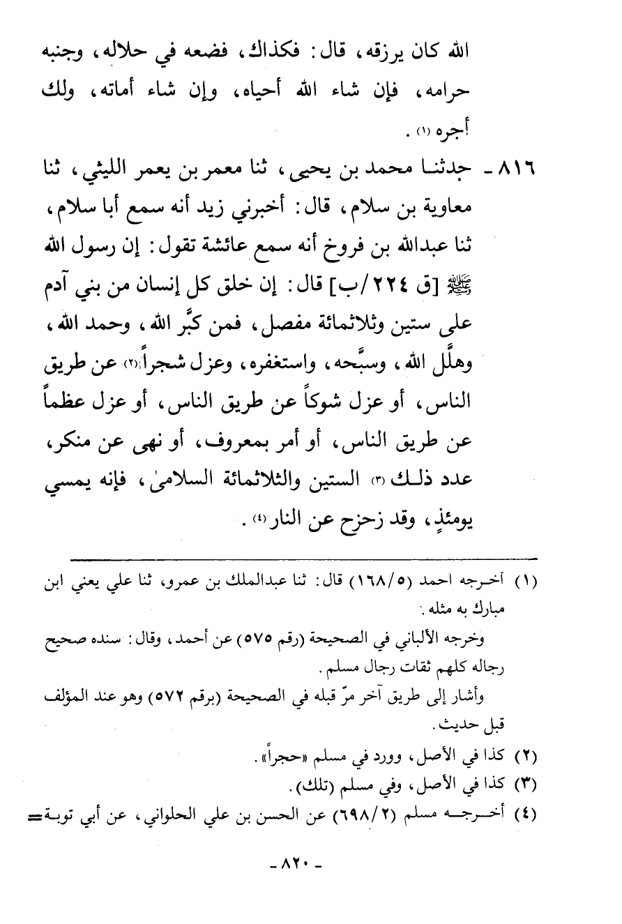 816 - حَدَّثَنَا مُحَمَّدُ بْنُ يَحْيَى، ثنا مَعْمَرُ بْنُ يَعْمَرَ اللَّيْثِيُّ، ثنا مُعَاوِيَةُ بْنُ سَلَّامٍ، قَالَ: أَخْبَرَنِي زَيْدٌ، أَنَّهُ سَمِعَ أَبَا سَلَّامٍ، ثنا عَبْدُ اللَّهِ بْنُ فَرُّوخَ، أَنَّهُ سَمِعَ عَائِشَةَ، تَقُولُ: إِنَّ رَسُولَ اللَّهِ صَلَّى اللهُ عَلَيْهِ وَسَلَّمَ قَالَ: «إِنَّ §خَلْقَ كُلَّ إِنْسَانٍ مِنْ بَنِي آدَمَ عَلَى سِتِّينَ وَثَلَاثِمِائَةِ مَفْصِلٍ فَمَنْ كَبَّرَ اللَّهَ، وَحَمِدَ اللَّهَ، وَهَلَّلَ اللَّهَ، وَسَبَّحَهُ، وَاسْتَغْفَرَهُ، وَعَزَلَ شَجَرًا عَنْ طَرِيقِ النَّاسِ، أَوْ عَزَلَ شَوْكًا عَنْ طَرِيقِ النَّاسِ، أَوْ عَزَلَ عَظْمًا عَنْ طَرِيقِ النَّاسِ أَوْ أَمَرَ بِمَعْرُوفٍ أَوْ نَهَى عَنْ مُنْكَرٍ عَدَدَ ذَلِكَ السِّتِّينَ وَالثَّلَاثِمِائَةٍ السُّلَامَى فَإِنَّهُ يُمْسِي يَوْمَئِذٍ وَقَدْ زُحْزِحَ عَنِ النَّارِ»