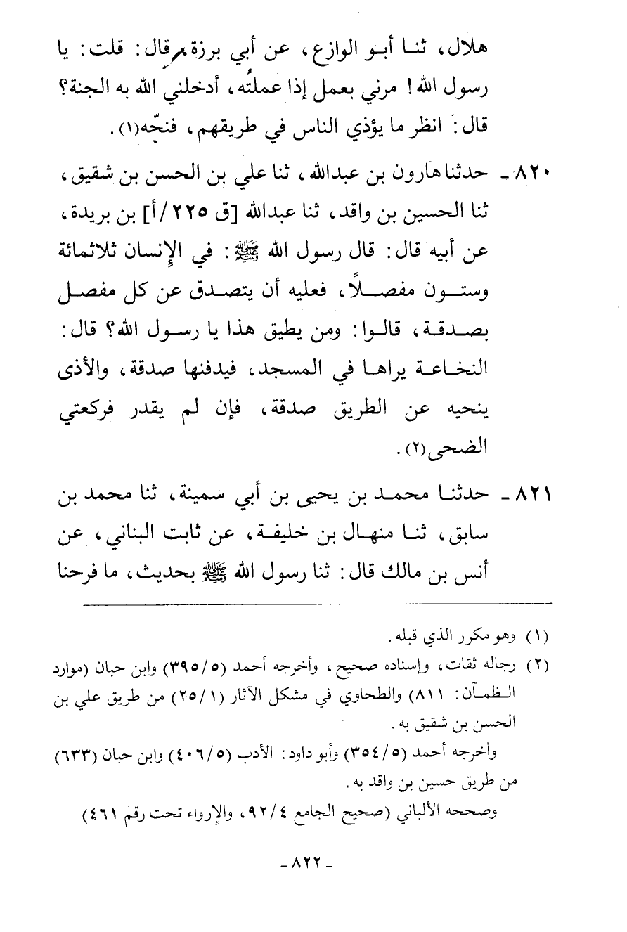 820 - حَدَّثَنَا هَارُونُ بْنُ عَبْدِ اللَّهِ، ثنا عَلِيُّ بْنُ الْحَسَنِ بْنِ شَقِيقٍ، ثنا الْحُسَيْنُ بْنُ وَاقِدٍ، ثنا عَبْدُ اللَّهِ بْنُ بُرَيْدَةَ، عَنْ أَبِيهِ، قَالَ: قَالَ رَسُولُ اللَّهِ صَلَّى اللهُ عَلَيْهِ وَسَلَّمَ: «§فِي الْإِنْسَانِ ثَلَاثُمِائَةٍ وَسِتُّونَ مَفْصِلًا فَعَلَيْهِ أَنْ يَتَصَدَّقَ عَنْ كُلِّ مَفْصِلٍ بِصَدَقَةٍ» قَالُوا: وَمَنْ يُطِيقُ هَذَا يَا رَسُولَ اللَّهِ؟ قَالَ: «النُّخَاعَةُ يَرَاهَا فِي الْمَسْجِدِ فَيَدْفِنُهَا صَدَقَةٌ، وَالْأَذَى يُنَحِّيهِ عَنِ الطَّرِيقِ صَدَقَةٌ فَإِنْ لَمْ يَقْدِرْ فَرَكْعَتَيِ الضُّحَى»
