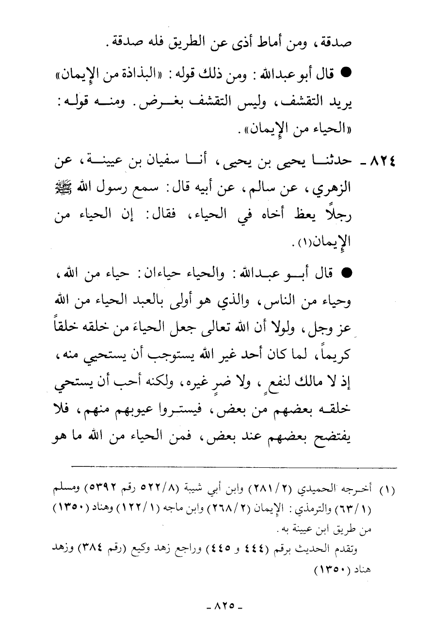 824 - حَدَّثَنَا يَحْيَى بْنُ يَحْيَى، أنا سُفْيَانُ بْنُ عُيَيْنَةَ، عَنِ الزُّهْرِيِّ، عَنْ سَالِمٍ، عَنْ أَبِيهِ، قَالَ: سَمِعَ رَسُولُ اللَّهِ صَلَّى اللهُ عَلَيْهِ وَسَلَّمَ رَجُلًا يَعِظُ أَخَاهُ فِي الْحَيَاءِ فَقَالَ: «إِنَّ §الْحَيَاءَ مِنَ الْإِيمَانِ» . قَالَ أَبُو عَبْدِ اللَّهِ: وَالْحَيَاءُ حَيَاءَانِ حَيَاءٌ مِنَ اللَّهِ، وَحَيَاءٌ مِنَ النَّاسِ، وَالَّذِي هُوَ أَوْلَى بِالْعَبْدِ الْحَيَاءُ مِنَ اللَّهِ عَزَّ وَجَلَّ، وَلَوْلَا أَنَّ اللَّهَ تَعَالَى جَعَلَ الْحَيَاءَ مِنْ خَلْقِهِ خُلُقًا كَرِيمًا لَمَا كَانَ أَحَدٌ غَيْرُ اللَّهِ يَسْتَوْجِبُ أَنْ يُسْتَحَى مِنْهُ إِذْ لَا مَالِكَ لِنَفْعٍ، وَلَا ضُرٍّ غَيْرَهُ، وَلَكِنَّهُ أَحَبَّ أَنْ يَسْتَحِيَ خَلْقُهُ بَعْضُهُمْ مِنْ بَعْضٍ فَيَسْتُرُوا عُيُوبَهُمْ مِنْهُمْ، فَلَا يَفْتَضِحُ بَعْضُهُمْ عِنْدَ بَعْضٍ، فَمِنَ الْحَيَاءِ مِنَ اللَّهِ مَا هُوَ -[826]- فَرْضٌ، وَمِنْهُ فَضِيلَةٌ وَنَافِلَةٌ، وَهُوَ هَائِجٌ عَنِ الْمَعْرِفَةِ بِعَظَمَةِ اللَّهِ وَجَلَالِهِ وَقُدْرَتِهِ، لِأَنَّهُ إِذَا ثَبَتَ تَعْظِيمُ اللَّهِ فِي قَلْبِ الْعَبْدِ أَوْرَثَهُ الْحَيَاءَ مِنَ اللَّهِ وَالْهَيْبَةِ لَهُ فَغَلَبَ عَلَى قَلْبِهِ ذِكْرُ اطِّلَاعِ اللَّهِ الْعَظِيمِ وَنَظَرِهِ بِعَظَمَتِهِ وَجَلَالِهِ إِلَى مَا فِي قَلْبِهِ وَجَوَارِحِهِ، وَذِكْرُ الْمَقَامِ غَدًا بَيْنَ يَدَيْهِ وَسُؤَالِهِ إِيَّاهُ عَنْ جَمِيعِ أَعْمَالِ قَلْبِهِ وَجَوَارِحِهِ، وَذِكْرُ دَوَامِ إِحْسَانِهِ إِلَيْهِ، وَقِلَّةِ الشُّكْرِ مِنْهُ لِرَبِّهِ فَإِذَا غَلَبَ ذِكْرُ هَذِهِ الْأُمُورِ عَلَى قَلْبِهِ هَاجَ مِنْهُ الْحَيَاءُ مِنَ اللَّهِ فَاسْتَحَى اللَّهَ أَنْ يَطَّلِعَ عَلَى قَلْبِهِ وَهُوَ مُعْتَقِدٌ لِشَيْءٍ مِمَّا يَكْرَهُ، أَوْ عَلَى جَارِحَةٍ مِنْ جَوَارِحِهِ، يَتَحَرَّكُ بِمَا يَكْرَهُ فَطَهَّرَ قَلْبَهُ مِنْ كُلِّ مَعْصِيَةٍ، وَمَنَعَ جَوَارِحَهُ مِنْ جَمِيعِ مَعَاصِيهِ إِذْ فَهِمَ عَنْهُ قَوْلَهُ: {ثُمَّ جَعَلْنَاكُمْ خَلَائِفَ فِي الْأَرْضِ مِنْ بَعْدِهِمْ لَنَنْظُرَ كَيْفَ تَعْمَلُونَ} [يونس: 14] وَقَالَ: {وَمَا تَكُونُ فِي شَأْنٍ وَمَا تَتْلُو مِنْهُ مِنْ قُرْآنٍ وَلَا تَعْمَلُونَ مِنْ عَمَلٍ إِلَّا كُنَّا عَلَيْكُمْ شُهُودًا إِذْ تُفِيضُونَ فِيهِ} [يونس: 61] وَقَالَ: {وَقُلِ اعْمَلُوا فَسَيَرَى اللَّهُ عَمَلَكُمْ وَرَسُولُهُ وَالْمُؤْمِنُونَ} [التوبة: 105] وَقَالَ مُنْكِرًا عَلَى مَنِ اسْتَخَفَّ بِنَظَرِهِ: {أَلَمْ يَعْلَمْ بِأَنَّ اللَّهَ يَرَى} [العلق: 14]