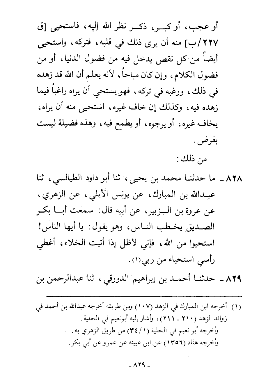 828 - مَا حَدَّثَنَا مُحَمَّدُ بْنُ يَحْيَى، ثنا أَبُو دَاوُدَ الطَّيَالِسِيُّ، ثنا عَبْدُ اللَّهِ بْنُ الْمُبَارَكِ، عَنْ يُونُسَ الْأَيْلِيِّ، عَنِ الزُّهْرِيِّ، عَنْ عُرْوَةَ بْنِ الزُّبَيْرِ، عَنْ أَبِيهِ، قَالَ: سَمِعْتُ أَبَا بَكْرٍ الصِّدِّيقَ، يَخْطُبُ النَّاسَ وَهُوَ يَقُولُ: «يَا أَيُّهَا النَّاسُ §اسْتَحْيُوا مِنَ اللَّهِ فَإِنِّي لَأَظَلُّ إِذَا أَتَيْتُ الْخَلَاءَ أُغَطِّي رَأْسِي اسْتِحْيَاءً مِنْ رَبِّي»