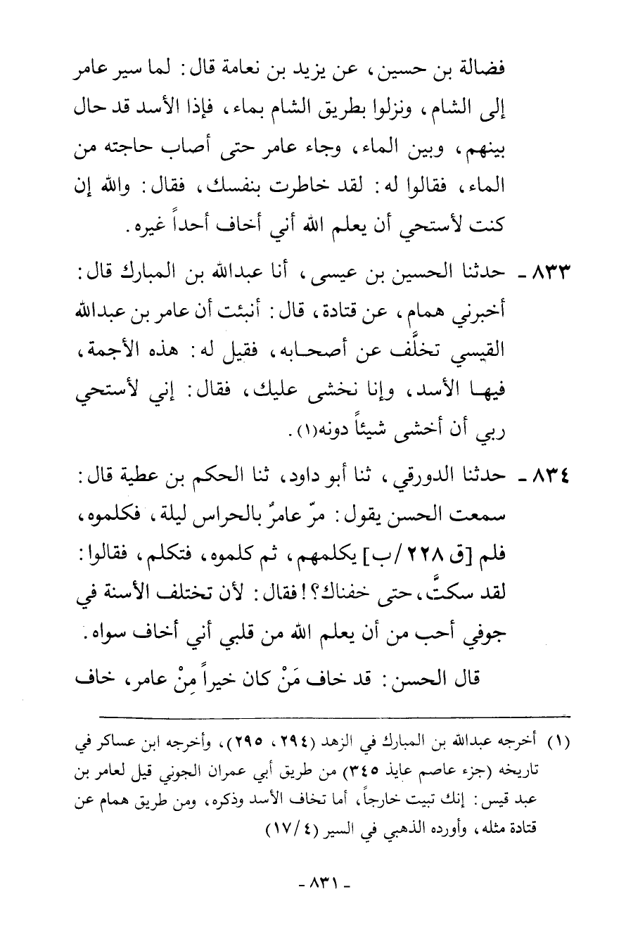 833 - حَدَّثَنَا الْحُسَيْنُ بْنُ عِيسَى، أنا عَبْدُ اللَّهِ بْنُ الْمُبَارَكِ، قَالَ: أَخْبَرَنِي هَمَّامٌ، عَنْ قَتَادَةَ، قَالَ: أُنْبِئْتُ أَنَّ عَامِرَ بْنَ عَبْدِ اللَّهِ الْقَيْسِيَّ، تَخَلَّفَ عَنْ أَصْحَابِهِ، فَقِيلَ لَهُ: §هَذِهِ الْأَجَمَةُ فِيهَا الْأَسَدُ وَإِنَّا نَخْشَى عَلَيْكَ، فَقَالَ: إِنِّي لَأَسْتَحِي رَبِّي أَنْ أَخْشَى شَيْئًا دُونَهُ "