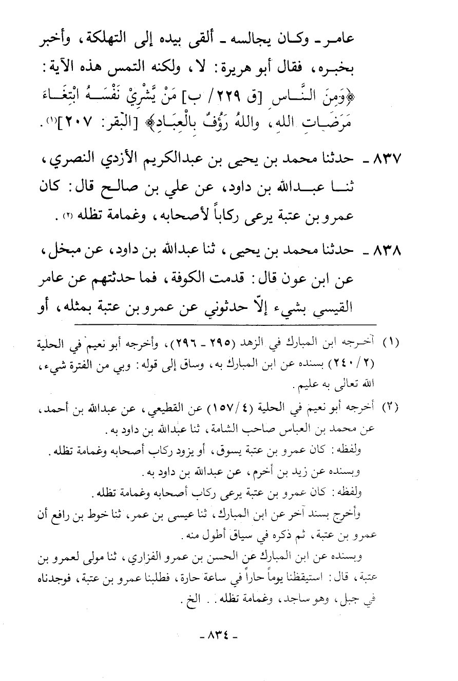 837 - حَدَّثَنَا مُحَمَّدُ بْنُ يَحْيَى بْنِ عَبْدِ الْكَرِيمِ الْأَزْدِيُّ النَّصْرِيُّ، ثنا عَبْدُ اللَّهِ بْنُ دَاوُدَ، عَنْ عَلِيِّ بْنِ صَالِحٍ، قَالَ: «كَانَ عَمْرُو بْنُ عُتْبَةَ §يَرْعَى رِكَابًا لِأَصْحَابِهِ وَغَمَامَةٌ تُظِلُّهُ»