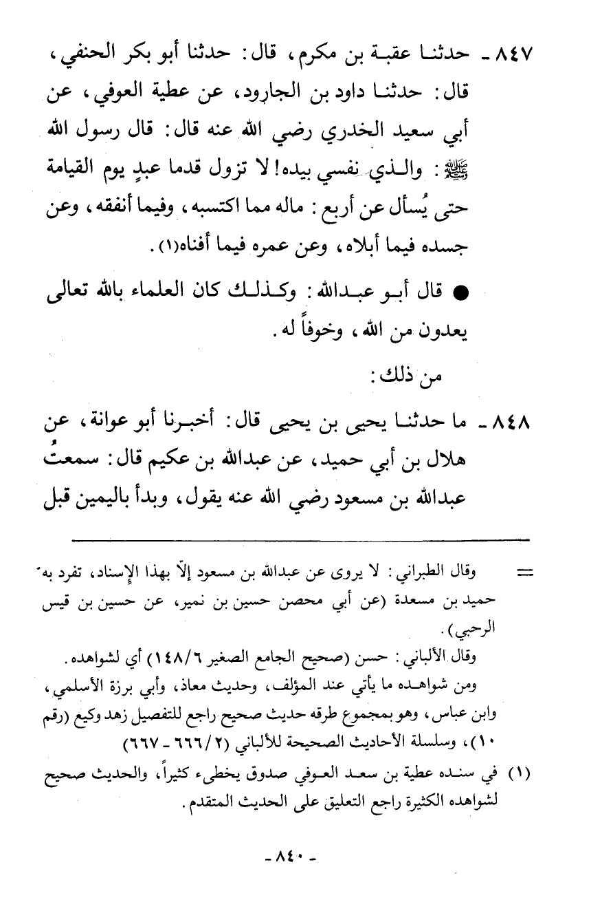 847 - حَدَّثَنَا عُقْبَةُ بْنُ مُكْرَمٍ، قَالَ: حَدَّثَنَا أَبُو بَكْرٍ الْحَنَفِيُّ، قَالَ: حَدَّثَنَا دَاوُدُ بْنُ الْجَارُودِ، عَنْ عَطِيَّةَ الْعَوْفِيِّ، عَنْ أَبِي سَعِيدٍ الْخُدْرِيٍّ رَضِيَ اللَّهُ، عَنْهُ قَالَ: قَالَ رَسُولُ اللَّهِ صَلَّى اللهُ عَلَيْهِ وَسَلَّمَ: «وَالَّذِي نَفْسِي بِيَدِهِ §لَا تَزُولُ قَدَمَا عَبْدٍ يَوْمَ الْقِيَامَةِ حَتَّى يُسْأَلَ عَنْ أَرْبَعٍ مَالِهِ مِمَّا اكْتَسَبَهُ وَفِيمَا أَنْفَقَهُ، وَعَنْ جَسَدِهِ فِيمَا أَبْلَاهُ، وَعَنْ عُمْرِهِ فِيمَا أَفْنَاهُ» قَالَ أَبُو عَبْدِ اللَّهِ: وَكَذَلِكَ كَانَ الْعُلَمَاءُ بِاللَّهِ تَعَالَى يَعُدُّونَ مِنَ اللَّهِ وَخَوْفًا لَهُ مِنْ ذَلِكَ.