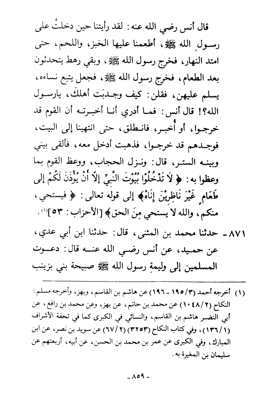 871 - حَدَّثَنَا مُحَمَّدُ بْنُ الْمُثَنَّى، قَالَ: حَدَّثَنَا ابْنُ أَبِي عَدِيٍّ، عَنْ حُمَيْدٍ، عَنْ أَنَسٍ، رَضِيَ اللَّهُ عَنْهُ قَالَ: «§دَعَوْتُ الْمُسْلِمِينَ إِلَى وَلِيمَةِ رَسُولِ اللَّهِ صَلَّى اللهُ عَلَيْهِ وَسَلَّمَ صَبِيحَةَ بَنَى بِزَيْنَبَ -[860]- بِنْتِ جَحْشٍ رَضِيَ اللَّهُ عَنْهَا فَأَوْسَعَهُمْ خُبْزًا وَلَحْمًا، ثُمَّ رَجَعَ كَمَا كَانَ يَصْنَعُ فَأَتَى حُجَرَ نِسَائِهِ فَسَلَّمَ عَلَيْهِنَّ وَدَعَوْنَ لَهُ فَرَجَعَ إِلَى بَيْتِهِ وَأَنَا مَعَهُ، فَلَمَّا انْتَهَيْنَا إِلَى الْبَيْتِ إِذَا رَجُلَانِ قَدْ جَرَى بِهِمَا الْحَدِيثُ فِي نَاحِيَةِ الْبَيْتِ فَلَمَّا أَبْصَرَهُمَا وَلَّى رَاجِعًا فَلَمَّا رَأَى الرَّجُلَانِ النَّبِيَّ صَلَّى اللهُ عَلَيْهِ وَسَلَّمَ وَلَّى عَنْ بَيْتِهِ قَامَا مُسْرِعَيْنِ فَلَا أَدْرِي أَنَا أَخْبَرْتُهُ أَوْ أُخْبِرَ فَرَجَعَ إِلَى بَيْتِهِ، وَأَرْخَى السِّتْرَ بَيْنِي وَبَيْنَهُ وَنَزَلَتْ آيَةُ الْحِجَابِ»