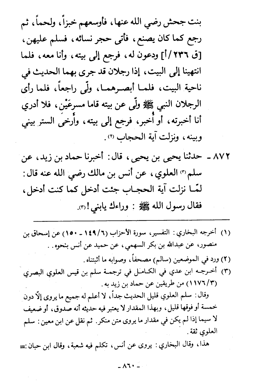 872 - حَدَّثَنَا يَحْيَى بْنُ يَحْيَى، قَالَ: أَخْبَرَنَا حَمَّادُ بْنُ زَيْدٍ، عَنْ سَلْمٍ الْعَلَوِيِّ، عَنْ أَنَسِ بْنِ مَالِكٍ رَضِيَ اللَّهُ عَنْهُ قَالَ: " §لَمَّا نَزَلَتْ آيَةُ الْحِجَابِ جِئْتُ أَدْخُلُ كَمَا كُنْتُ أَدْخُلُ فَقَالَ رَسُولُ اللَّهِ صَلَّى اللهُ عَلَيْهِ وَسَلَّمَ: «وَرَاءَكَ يَا بُنَيَّ»