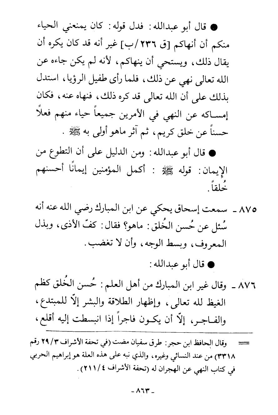 875 - سَمِعْتُ إِسْحَاقَ، يَحْكِي عَنِ ابْنِ الْمُبَارَكٍ رَضِيَ اللَّهُ، عَنْهُ أَنَّهُ §سُئِلَ عَنْ حُسْنِ الْخُلُقِ، مَا هُوَ؟ فَقَالَ: كَفُّ الْأَذَى، وَبَذْلُ الْمَعْرُوفِ، وَبَسْطُ الْوَجْهِ وَأَنْ لَا تَغْضَبَ " قَالَ أَبُو عَبْدِ اللَّهِ:
