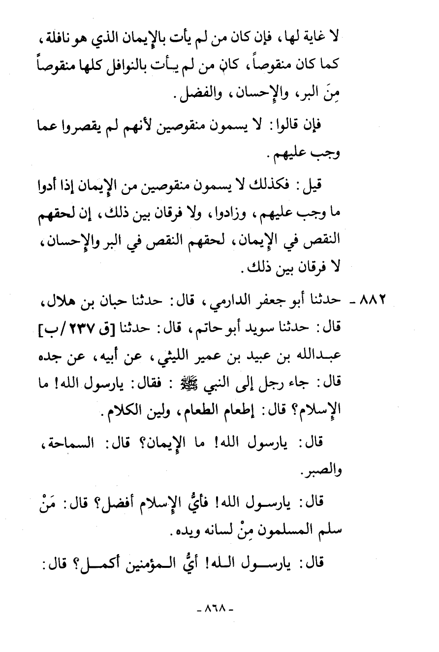 882 - حَدَّثَنَا أَبُو جَعْفَرٍ الدَّارِمِيُّ، قَالَ: حَدَّثَنَا حَبَّانُ بْنُ هِلَالٍ، قَالَ: حَدَّثَنَا سُوَيْدٌ أَبُو حَاتِمٍ، قَالَ: حَدَّثَنَا عَبْدُ اللَّهِ بْنُ عُبَيْدِ بْنِ عُمَيْرٍ اللَّيْثِيُّ، عَنْ أَبِيهِ، عَنْ جَدِّهِ، قَالَ: جَاءَ رَجُلٌ إِلَى النَّبِيِّ صَلَّى اللهُ عَلَيْهِ وَسَلَّمَ فَقَالَ: يَا رَسُولَ اللَّهِ §مَا الْإِسْلَامُ؟ قَالَ: إِطْعَامُ الطَّعَامِ، وَلِينُ الْكَلَامِ " قَالَ: يَا رَسُولَ اللَّهِ مَا الْإِيمَانُ؟ قَالَ: «السَّمَاحَةُ وَالصَّبْرُ» قَالَ: يَا رَسُولَ اللَّهِ فَأَيُّ الْإِسْلَامِ أَفْضَلُ؟ قَالَ: «مَنْ سَلِمَ الْمُسْلِمُونَ مِنْ لِسَانِهِ وَيَدِهِ» قَالَ: يَا رَسُولَ اللَّهِ أَيُّ الْمُؤْمِنِينَ أَكْمَلُ قَالَ -[869]-: «أَحْسَنُهُمْ خُلُقًا» قَالَ: يَا رَسُولَ اللَّهِ أَيُّ الْقَتْلِ أَشْرَفُ قَالَ: «مَنْ أُهَرِيقَ دَمُهُ وَعُقِرَ جَوَادُهُ» قَالَ: يَا رَسُولَ اللَّهِ فَأَيُّ الصَّدَقَةِ أَفْضَلُ؟ قَالَ: «جَهْدُ الْمُقِلِّ» قَالَ: يَا رَسُولَ اللَّهِ فَأَيُّ الصَّلَاةِ أَفْضَلُ؟ قَالَ: «طُولُ الْقُنُوتِ» قَالَ: يَا رَسُولَ اللَّهِ فَأَيُّ الْهِجْرَةِ أَفْضَلُ؟ قَالَ: «مَنْ هَجَرَ السُّوءَ»