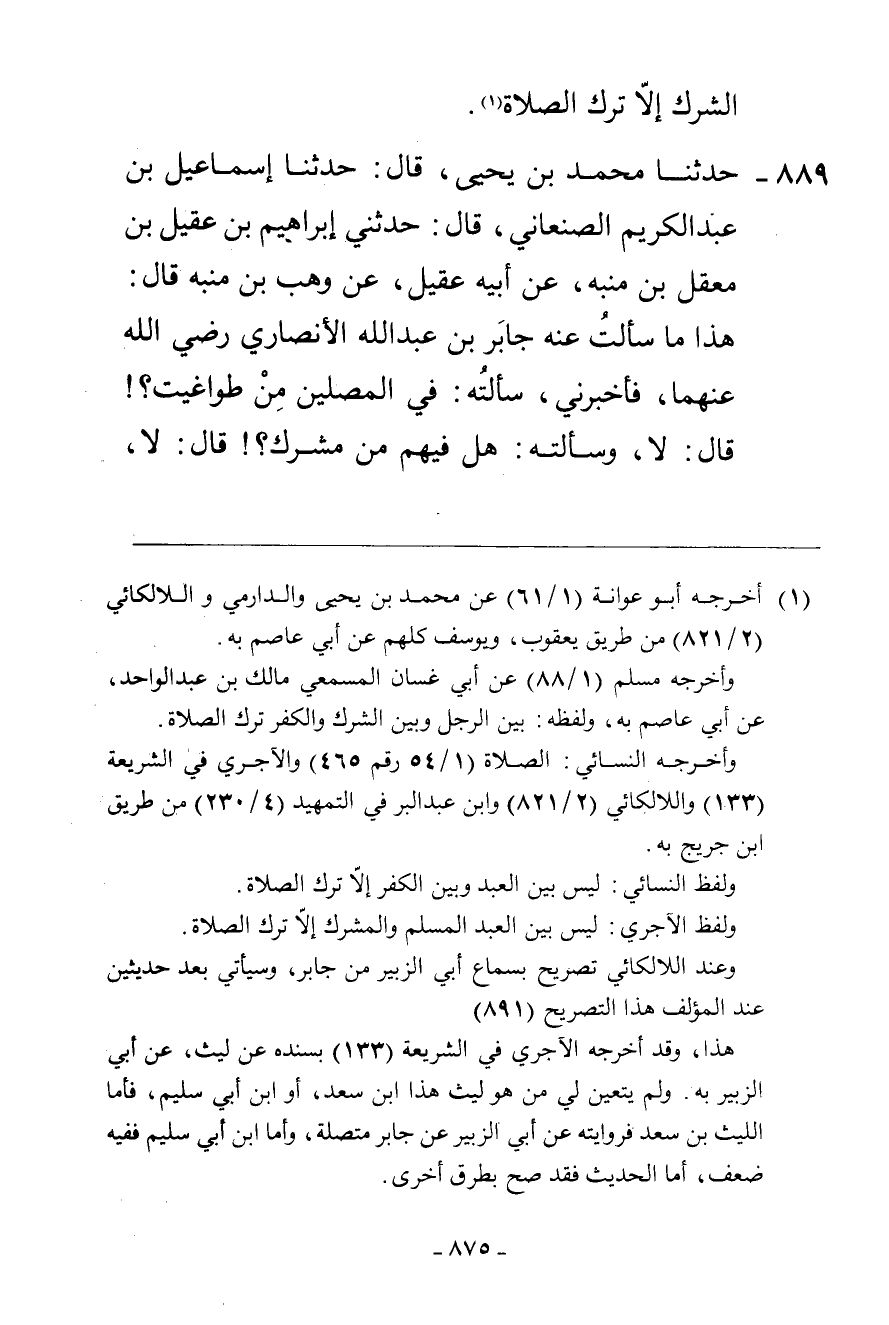 889 - حَدَّثَنَا مُحَمَّدُ بْنُ يَحْيَى، قَالَ: حَدَّثَنَا إِسْمَاعِيلُ بْنُ عَبْدِ الْكَرِيمِ الصَّنْعَانِيُّ، قَالَ: حَدَّثَنِي إِبْرَاهِيمُ بْنُ عَقِيلِ بْنِ مَعْقِلِ بْنِ مُنَبِّهٍ، عَنْ أَبِيهِ عَقِيلٍ، عَنْ وَهْبِ بْنِ مُنَبِّهٍ، قَالَ: هَذَا مَا سَأَلْتُ عَنْهُ جَابِرَ بْنَ عَبْدِ اللَّهِ الْأَنْصَارِيَّ رَضِيَ اللَّهُ عَنْهُمَا فَأَخْبَرَنِي سَأَلْتُهُ فِي الْمُصَلِّينَ مِنْ طَوَاغِيتَ؟ قَالَ: لَا وَسَأَلْتُهُ: هَلْ فِيهِمْ مِنْ مُشْرِكٍ؟ قَالَ: لَا، وَأَخْبَرَنِي أَنَّهُ سَمِعَ النَّبِيَّ صَلَّى اللهُ عَلَيْهِ وَسَلَّمَ يَقُولُ: «§بَيْنَ الشِّرْكِ وَالْكُفْرِ تَرْكُ الصَّلَاةِ» وَسَأَلْتُهُ: أَكَانُوا يَدْعُونَ الذُّنُوبَ شِرْكًا؟ قَالَ: مَعَاذَ اللَّهِ وَلَمْ يَكُنْ يَدْعُونَ فِي الْمُصَلِّينَ مُشْرِكًا